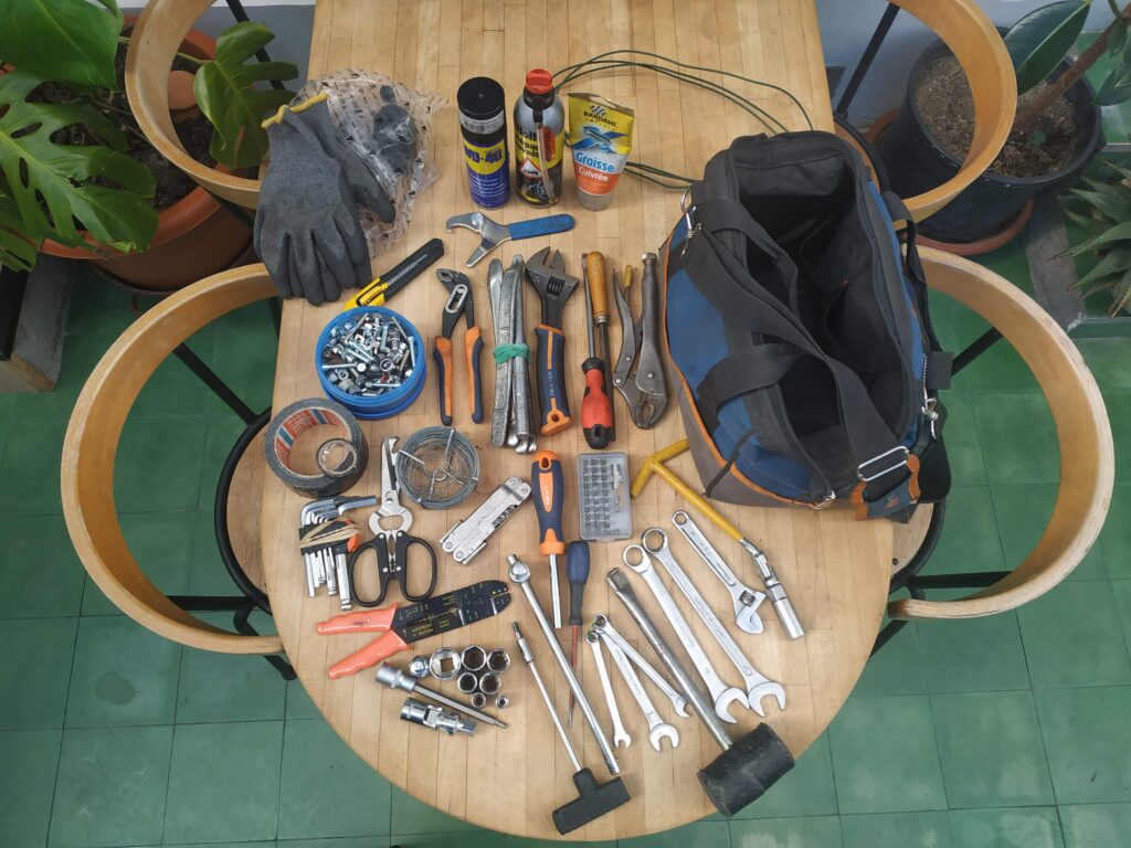 Restait la trousse à outils : elle faisait 11 kg jusqu’ici, beaucoup trop lourd ! Il fallait faire beaucoup mieux. Je n’ai donc retenu qu’un minimum d’outils multifonctions, un petit stock de visserie, quelques clés et douilles spécifiques. Il faut au moins pouvoir démonter le side, les roues, faire les entretiens, et réparer le plus courant avec ce kit maintenant ramené à 7kg.