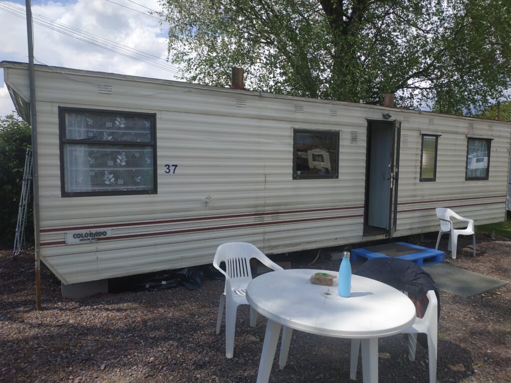 Au camping, on est accueilli par Micheline, qui nous dit qu’il va pleuvoir fort cette nuit et qu’elle peut nous proposer une caravane. Affaire conclue : mais trouble dès qu’on arrive devant :