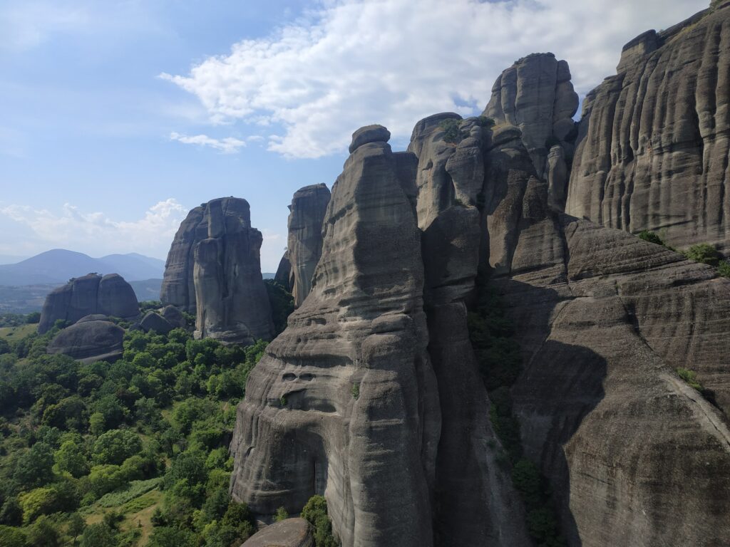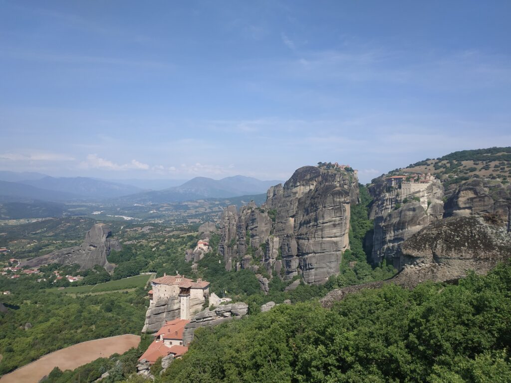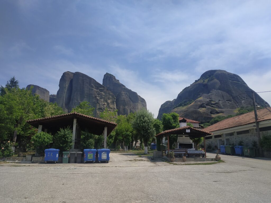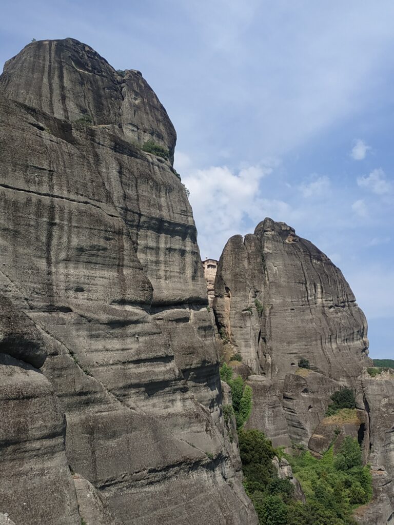 L’arrivée aux Météores se fait par touches successives, on les repère de loin, on les approche, puis elles nous font face ! Nous les contournerons demain car le circuit pour les voir toutes fait une quinzaine de kilomètres.