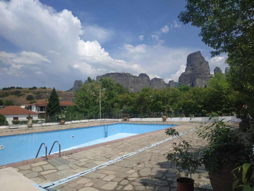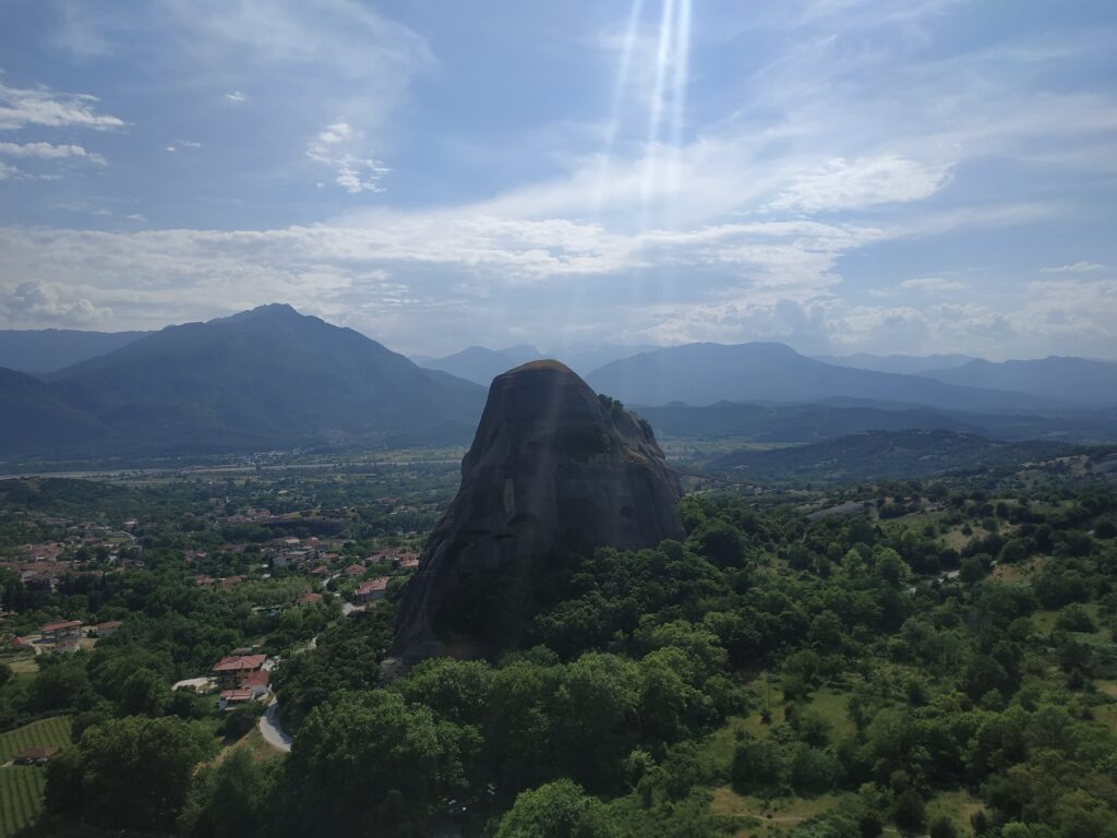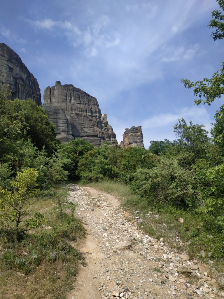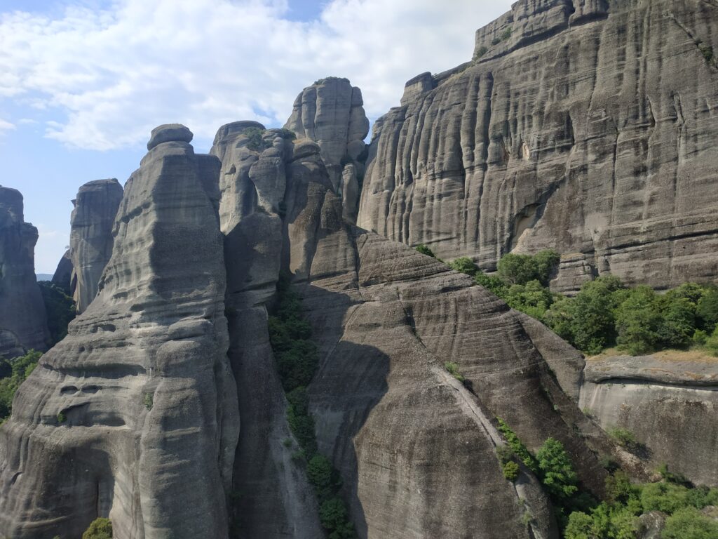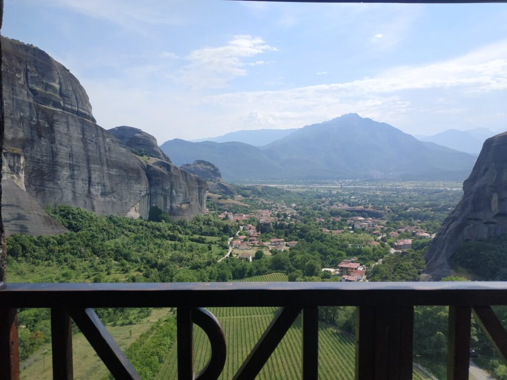 L’arrivée aux Météores se fait par touches successives, on les repère de loin, on les approche, puis elles nous font face ! Nous les contournerons demain car le circuit pour les voir toutes fait une quinzaine de kilomètres.