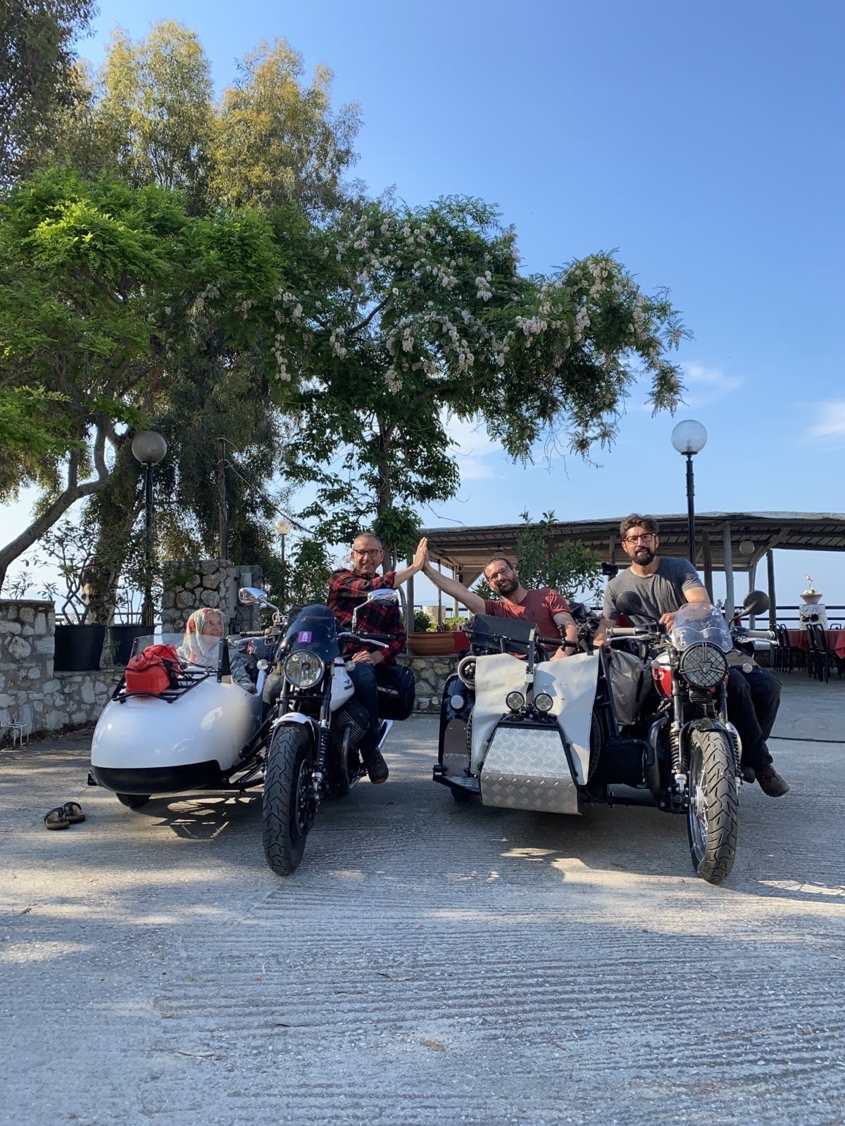 On a fait la photo ce matin : les deux équipages Alternative Sidecar de Marc et François sur Triumph 900 … Plus