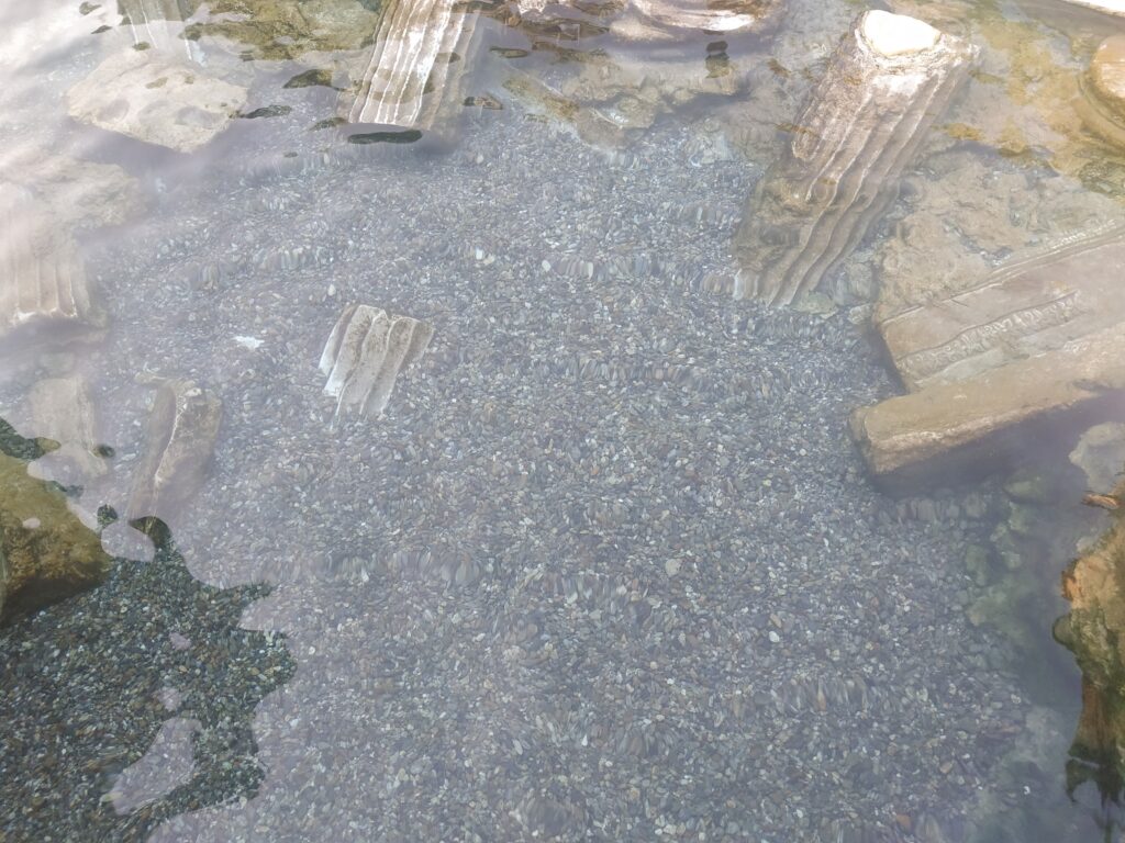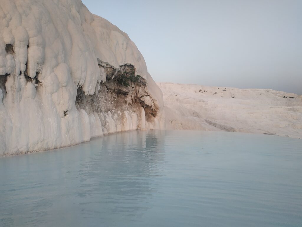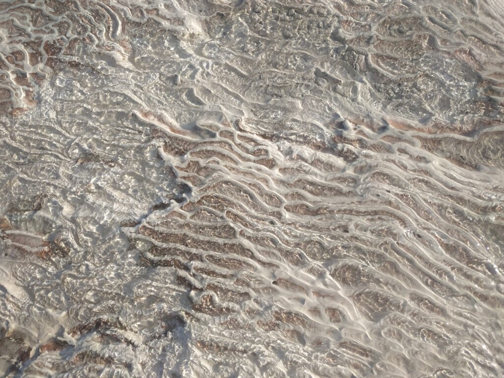 Ce qu’on pouvait prendre de loin pour de la glace ou de la neige, est une concrétion calcaire apportée par l’eau des bains, riche en minéraux. Leurs écoulements ont formé ces travertins.