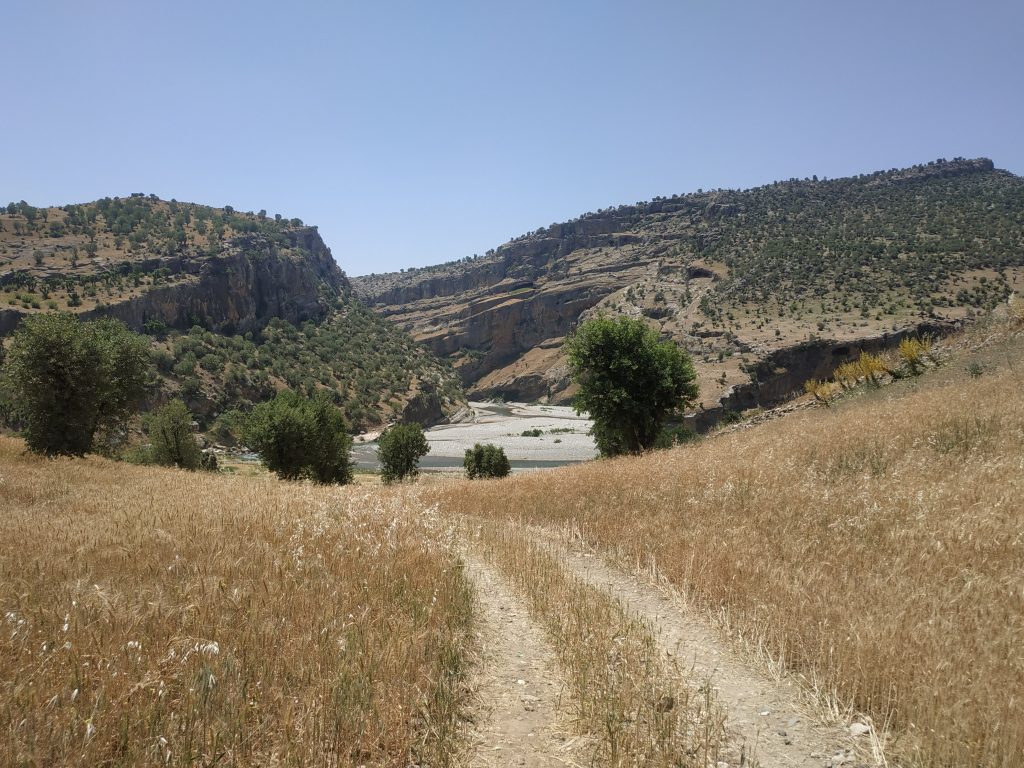 On a trouvé cette piste au milieu des blés et l’avons suivie à pied jusqu’au bord de l’eau en tapant dans nos mains puis avec un bâton parce-qu’on on craint les vipères.