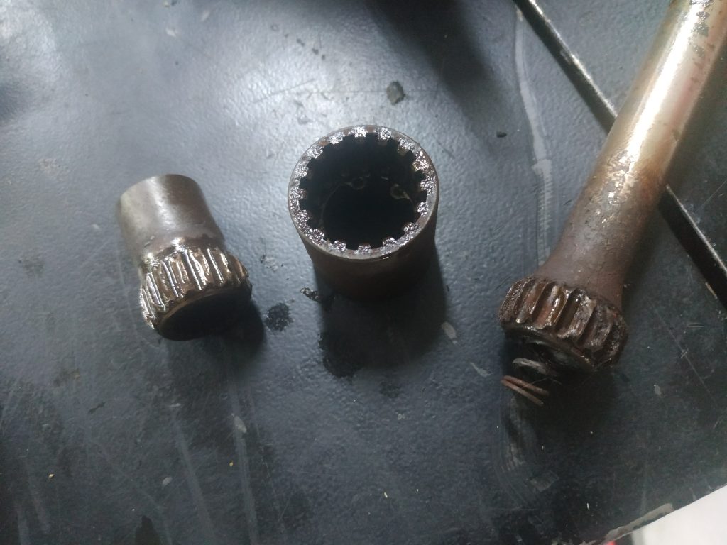 Le raccord, le manchon et le cardan (dont le croisillon n’a aucun jeu), aux cannelures si usées qu’elles ne tiennent plus la charge.