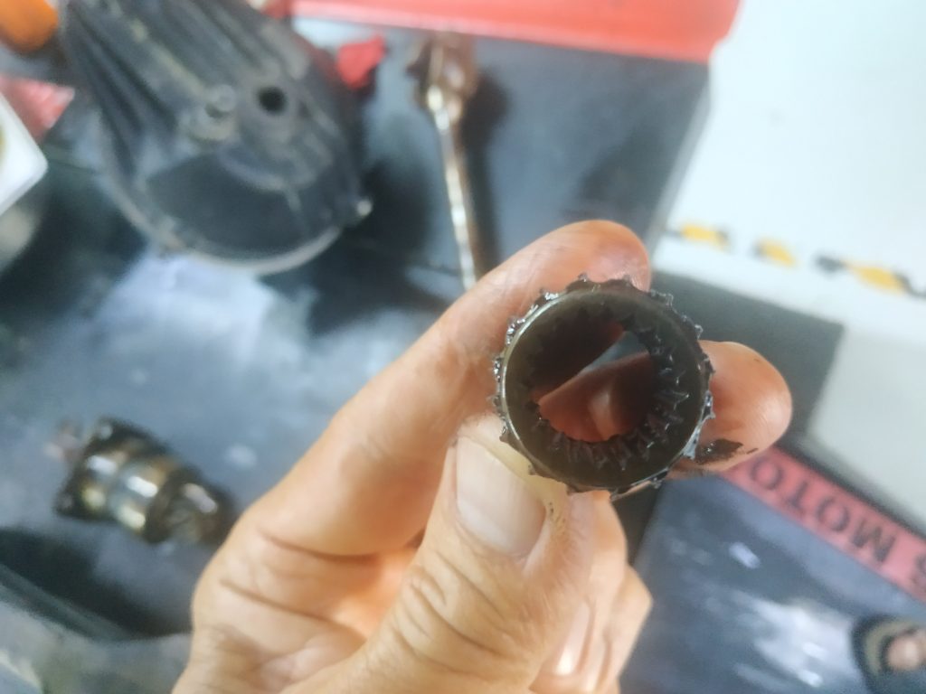 De G à D : le bras oscillant, dans lequel tourne le cardan ; l’arbre de vis sans fin du couple conique ; le couple conique (en arrière plan) ; les 3 pièces à changer (en avant plan), cannelures usées.