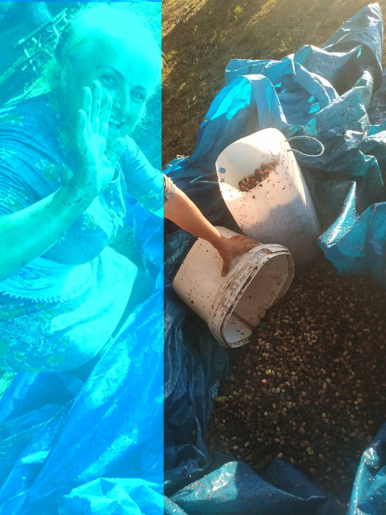 Des enfants viennent à l’aide des vieilles femmes mais se fatiguent rapidement. Je prends le relais à un coin de bâche. Nous avons ramassé une bonne dizaine de grands seaux sous trois mûriers, un rouge et deux blancs. Après ça évidemment on est tout collant de sucre !