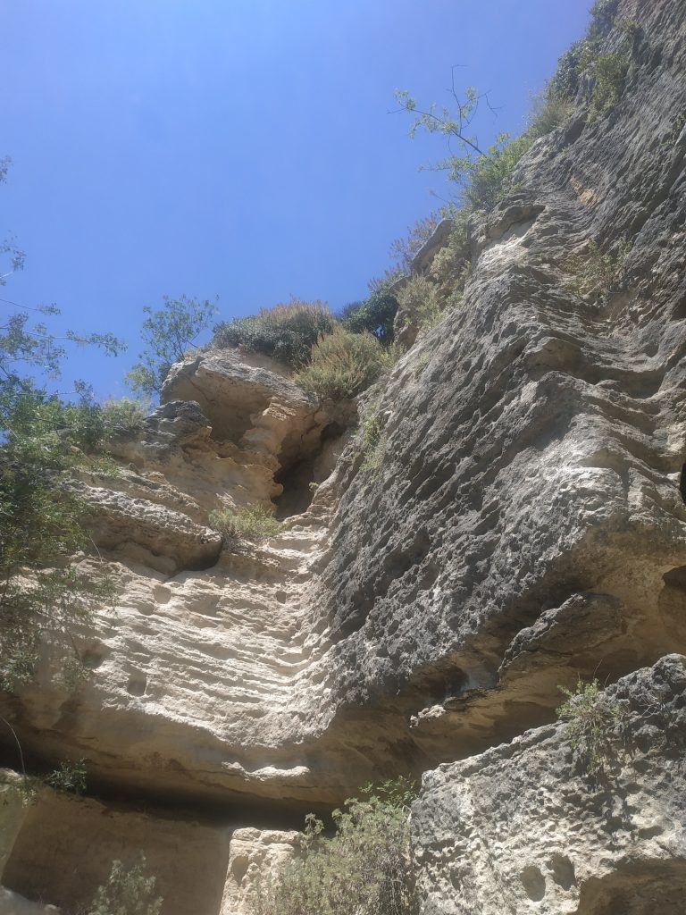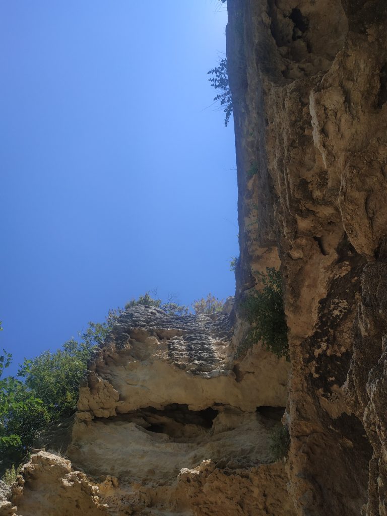 Pour traverser le tunnel au bout de la faille, il faut s’éclairer car il fait nuit noire et les roches sont glissantes et le sol accidenté. C’est en fait le lit d’une rivière détournée par les Romains pour l’empêcher de nuire dans le village lors des périodes de crues.