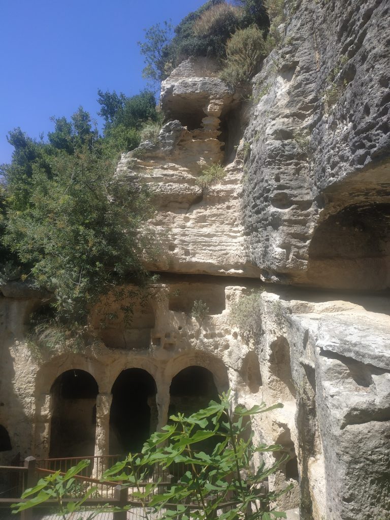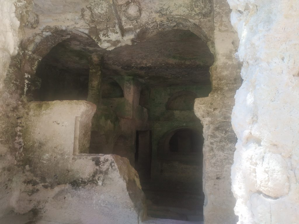 Le site se montre riche et vaste, sur 3 étages, directement creusés dans la roche calcaire… Piliers et colonnes sont encore apparents. On est saisis par l’esprit des lieux.