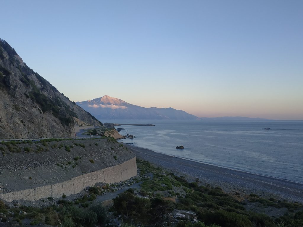 On a traversé plusieurs villages dans lesquels les voitures sont rares, et les petits tracteurs 4×4 nombreux. Puis retrouvé peu à peu l’étonnante route côtière, au beau revêtement et flanquée de sa piste cyclable d’un beau bleu, sur près de 25 kms. Pas tranquilles tout a fait non plus car la falaise dans laquelle cette belle route est taillée est très pentue et très friable, et les filets et pare avalanches sont à la peine devant les assauts des nombreuses chutes de pierres… Un peu plus loin d’ailleurs, un tractopelle fait des rotations pour dégager les amas de roches tombés sur la route.