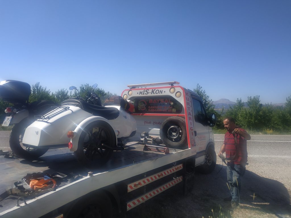 La dépanneuse arrive, se gare pile poil devant le side, on salue le chauffeur, il demande l’aide de Mehmet pour placer ses rampes au bon écartement des roues du side. Il l’attache ensuite fermement et avec précautions.
