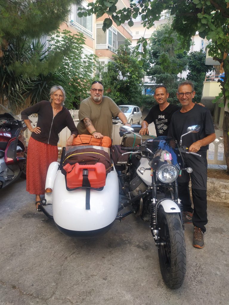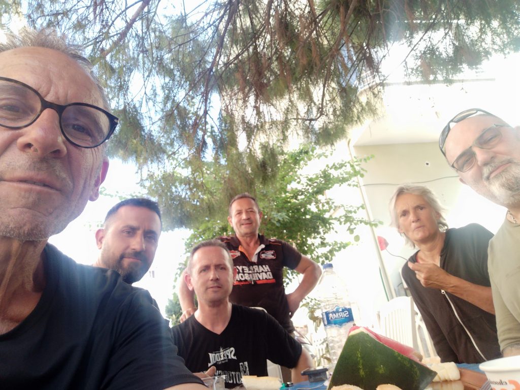 Adnan à droite, qui roule en 1000 DL Suzuki et traducteur de talent, Nathalie qu’on ne présente plus, les 3 frères et moi.