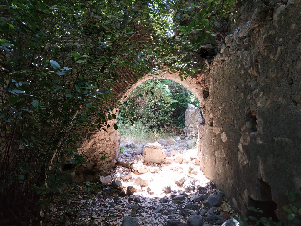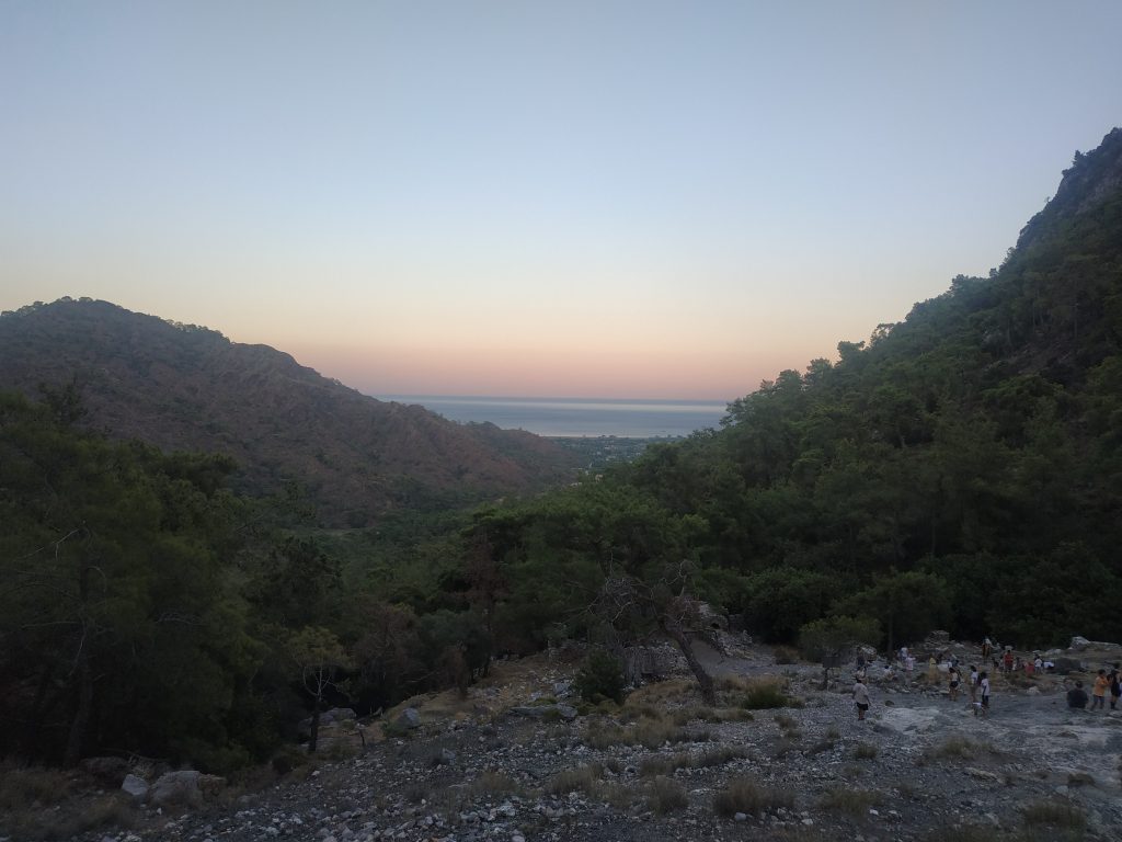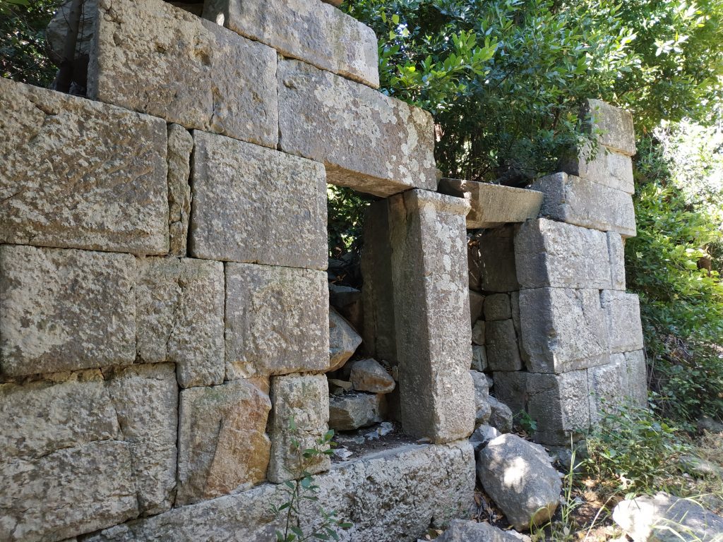 Il faut ensuite grimper par un sentier préparé, avec de belles marches en pierres locales, sur près de quarante minutes, avec un soleil encore chaud et une belle déclivité. La végétation, est faite de petits feuillus nous permettant de nous élever en restant à l’ombre. En se retournant, on voit de plus en plus apparaître la mer au creux du « V » de la vallée.