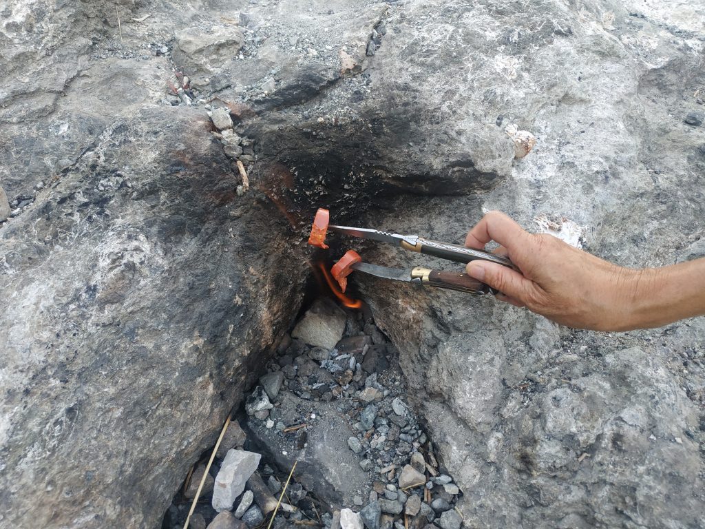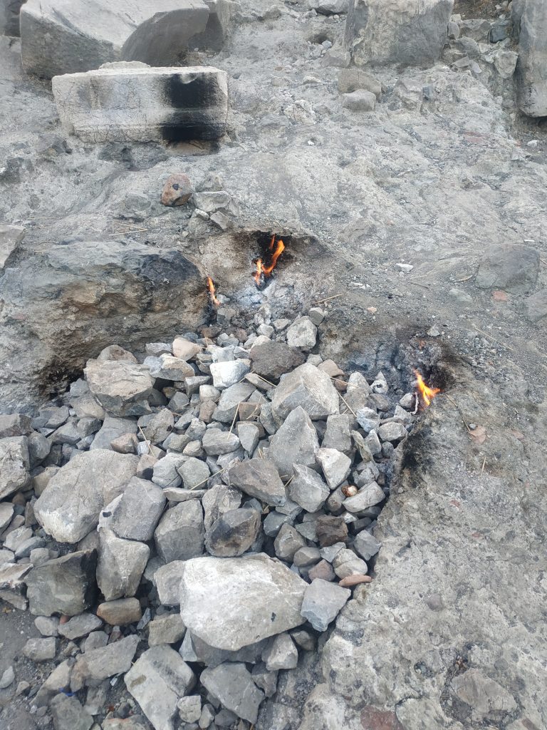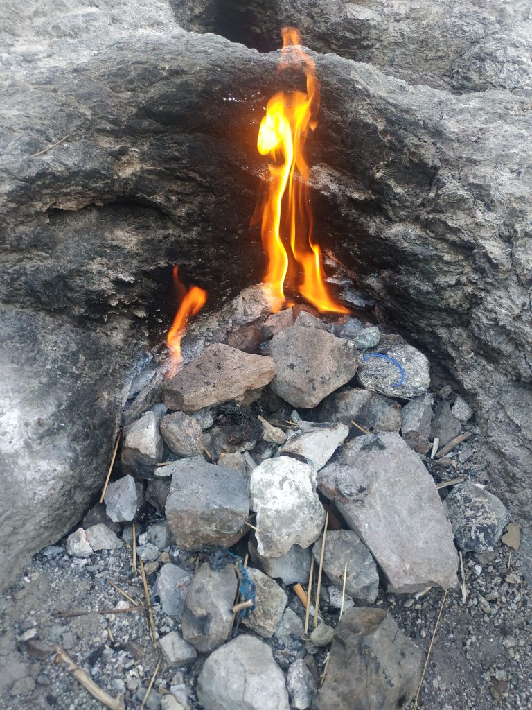 La végétation devient plus clairsemée à mesure de la progression, les feuillus du départ ont laissé place aux pins, jusqu’à ce que le sol devienne rocheux uniquement, jusqu’à cette dalle constellée de flammes, plus ou moins longues : du méthane sort du sol ici naturellement !