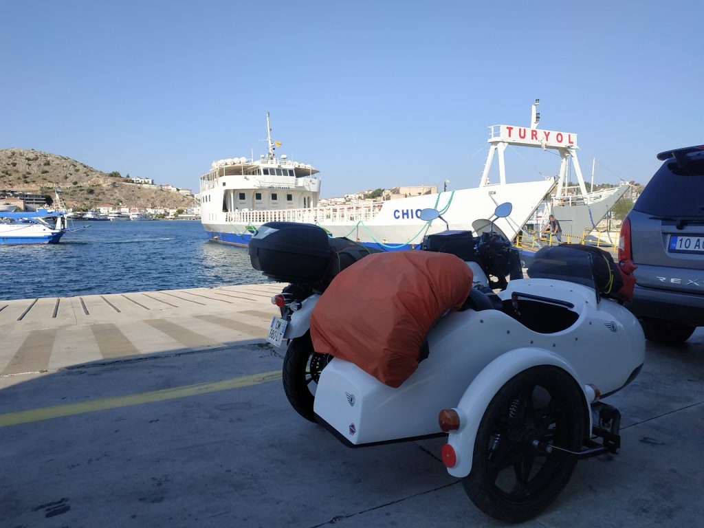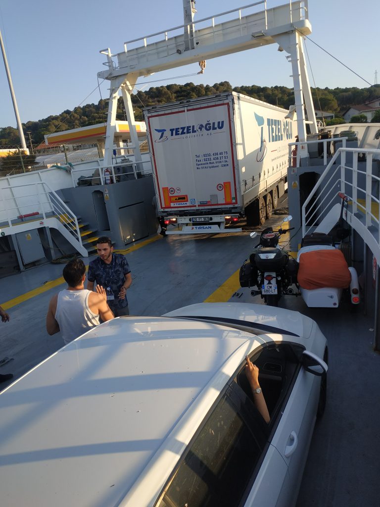 Sur ce petit rafiot, 5 x 38 tonnes, 1×19 tonnes, 6 voitures, 1 camping car, 3 motos, 1 sidecar, en avant dernier vont prendre leur place. Et le Tetris sera complet. J’ai cru qu’on ne monterai jamais à bord…
