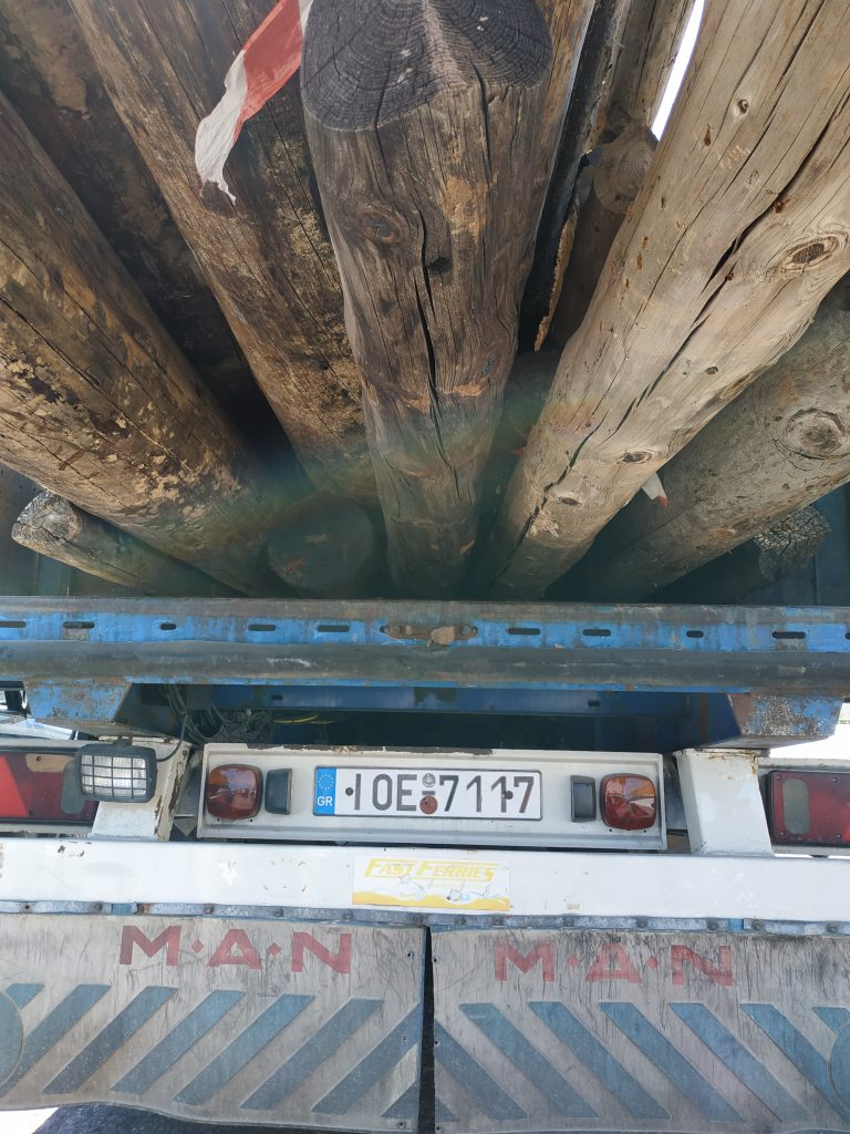Et chacun deale avec l’ombre, car le voyageur et client des compagnies de ferry est laissé des heures durant par 35 à 40 degrés sous le soleil d’un parking sans ombre. Pour nous ce sera à l’abri, sous ces grumes de bois, on a vérifié que le chauffeur nous voyait dans son rétro.