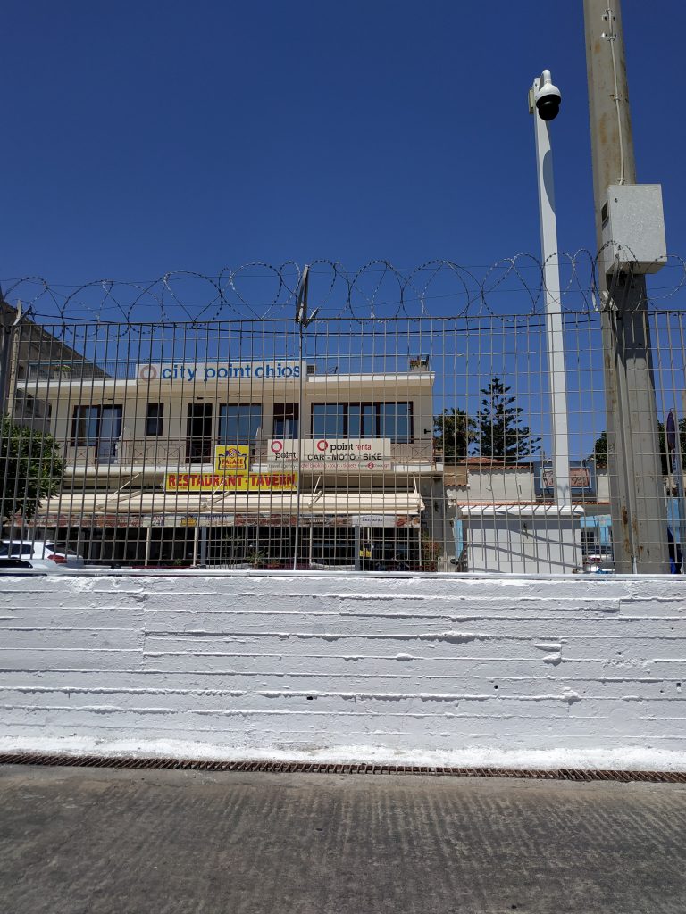 C’est à ces quelques signes qu’on sait que les frontières ici ne sont ouvertes qu’à celles et ceux qui ont les bons passeports. L’enceinte d’embarquement est protègée par un barbelé féroce et des caméras vidéo à 360 degrés complètent le dispositif. A l’entrée du port, je cherche des toilettes, j’approche d’un Algeco, mais c’est le local très discret du personnel Frontex. A côté, un bateau militaire Grec, avec tourelle de mitrailleuse, rappelle qu’on est aussi sur cette mer, en tensions récurrentes avec les Turcs qui disputent à la Grèce, la souveraineté de ses îles.
