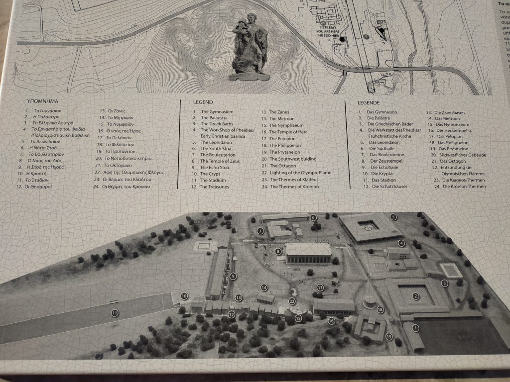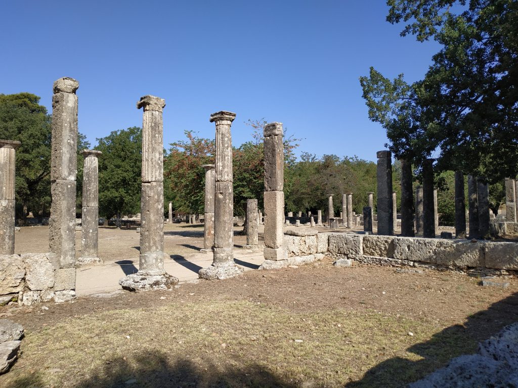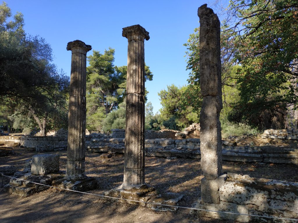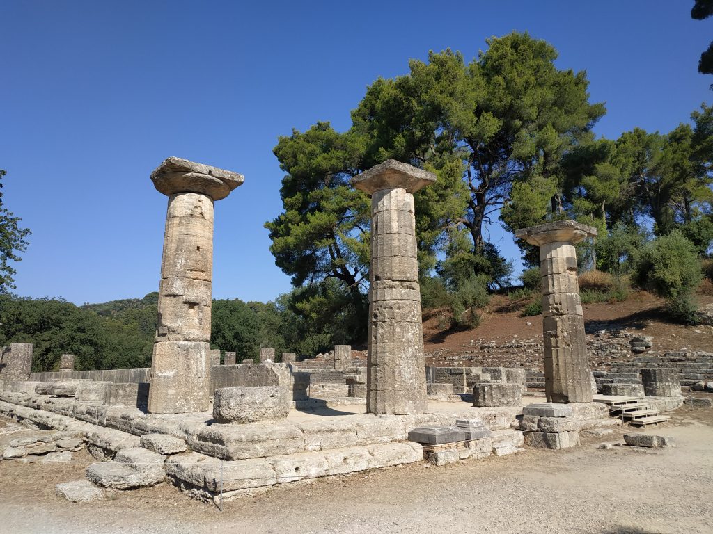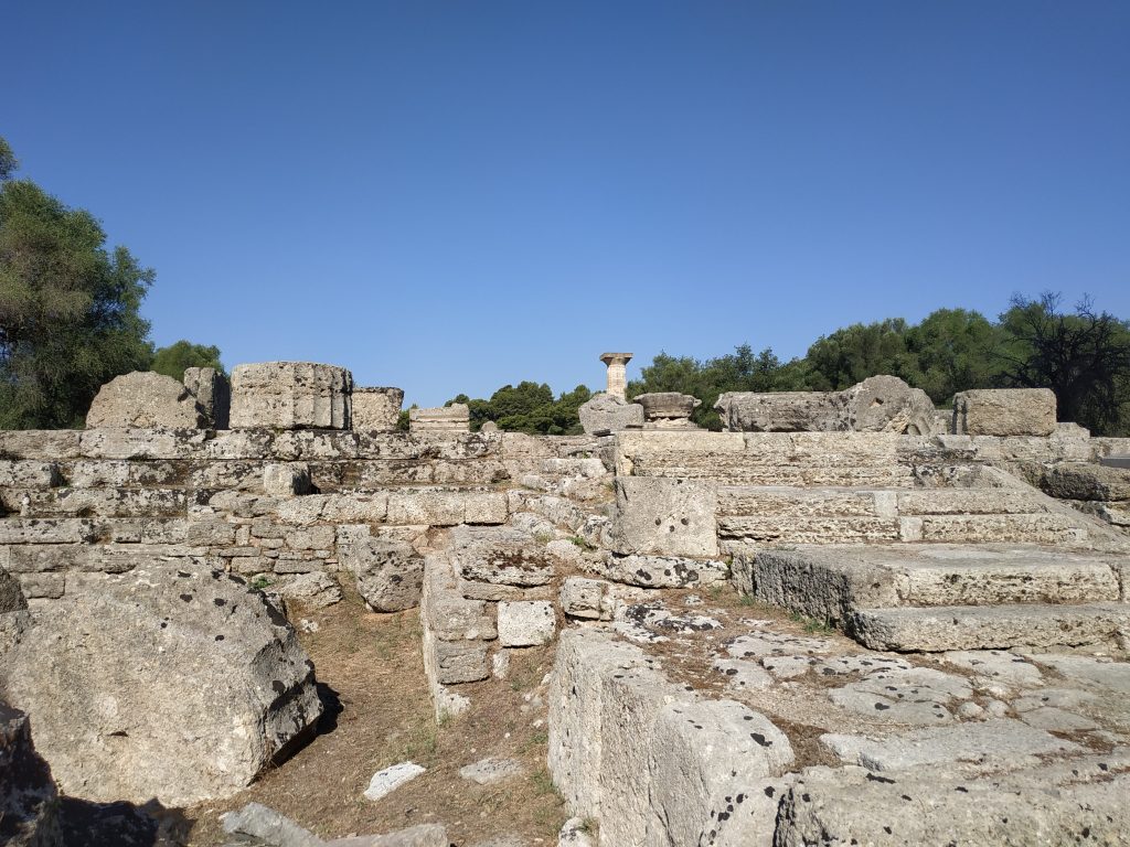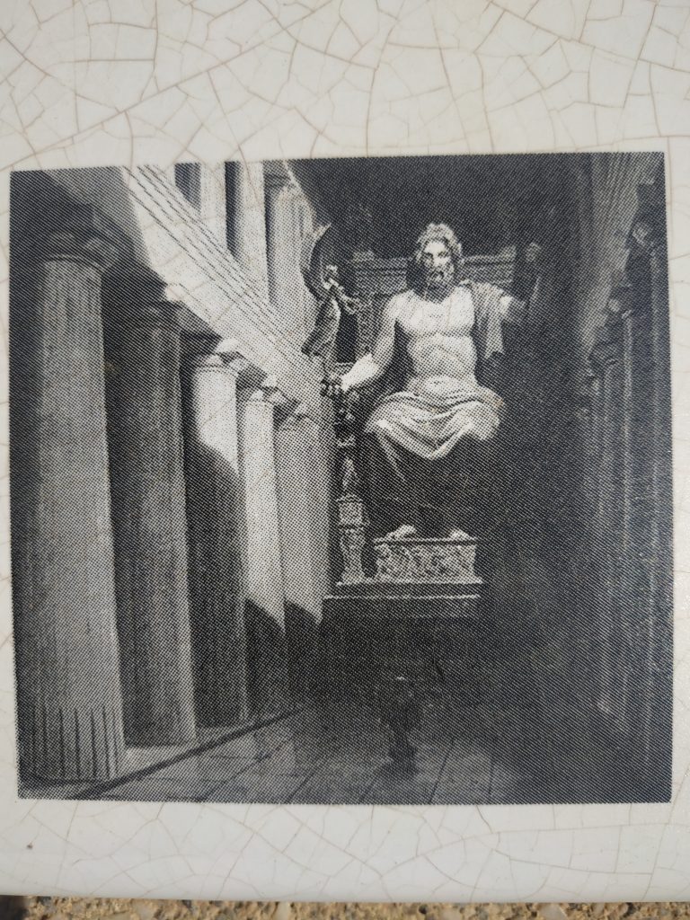 C’est là aussi que trônait la statue de Zeus, faite de bois et d’ivoire recouverte d’or. L’une des 7 merveilles du monde de l’antiquité (dont seules les pyramides de Gizeh subsistent aujourd’hui intégralement).