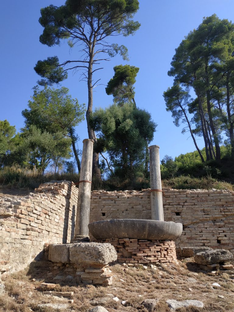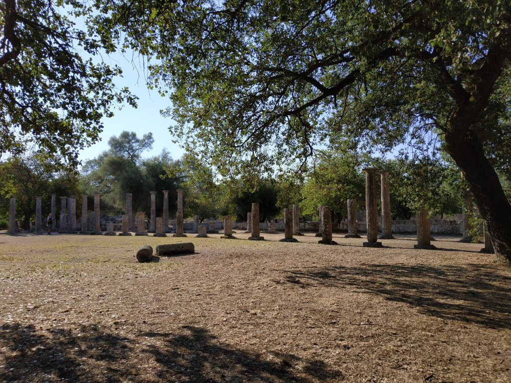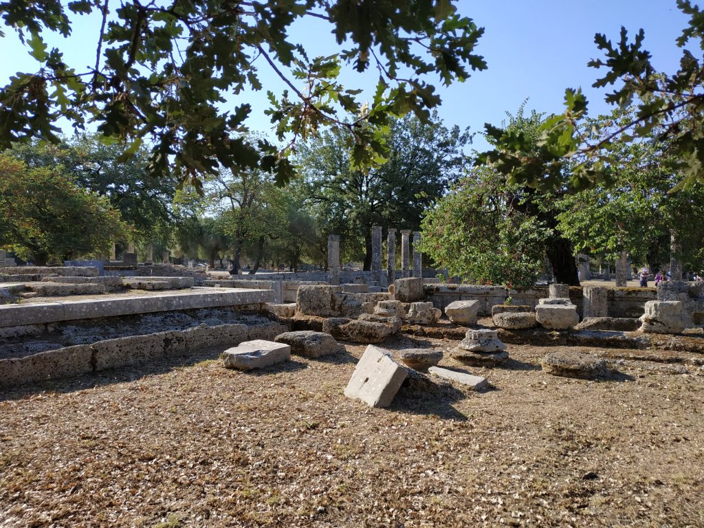 Le site d’Olympia est très vaste et ne se laisse pas aborder au premier coup d’oeil. Les restes des bâtiments, temples, autels, lieux de rituels émergent ça et là au milieu d’une végétation riche et dense de feuillus principalement des chênes. On ne sait pas trop ce que l’on voit, mais on entre en familiarité peu à peu.