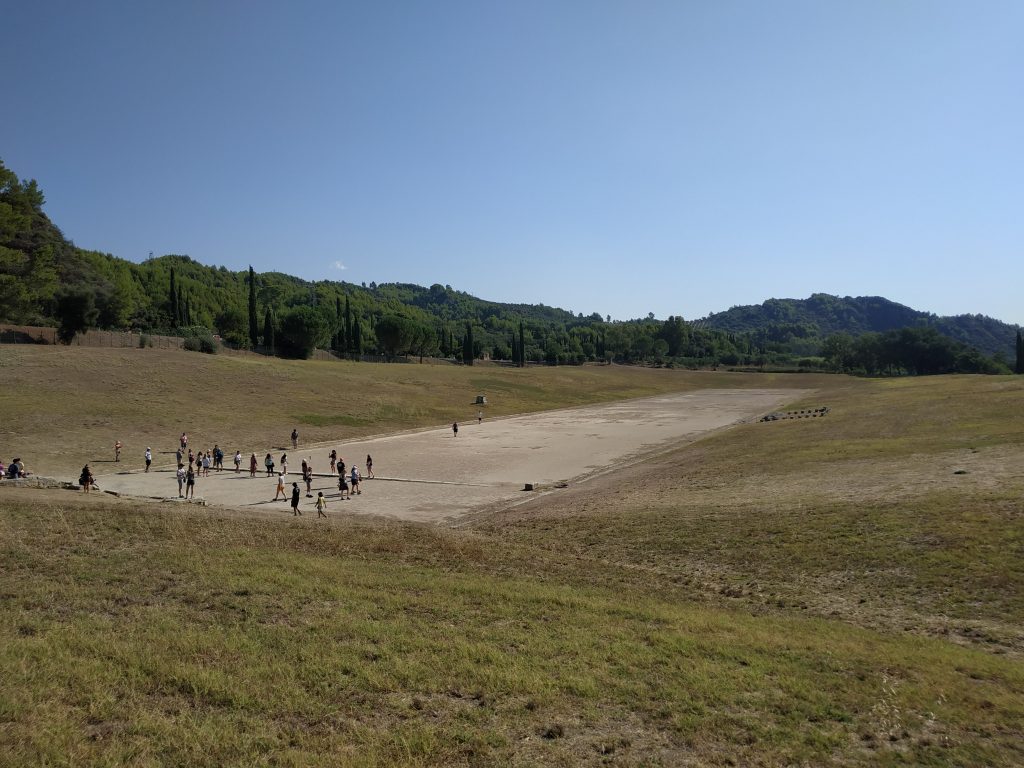 Un peu plus loin est-il émouvant d’entrer dans le stade qui contenait tout de même 45.000 spectateurs. Les femmes, alors interdites de stade, pouvaient suivre les compétitions à distance depuis la montagne (colline) toute proche. Aucune place en pierre ici, contrairement à de nombreux stades Grecs ou Romains, seulement une pente herbeuse inclinée vers la piste centrale.