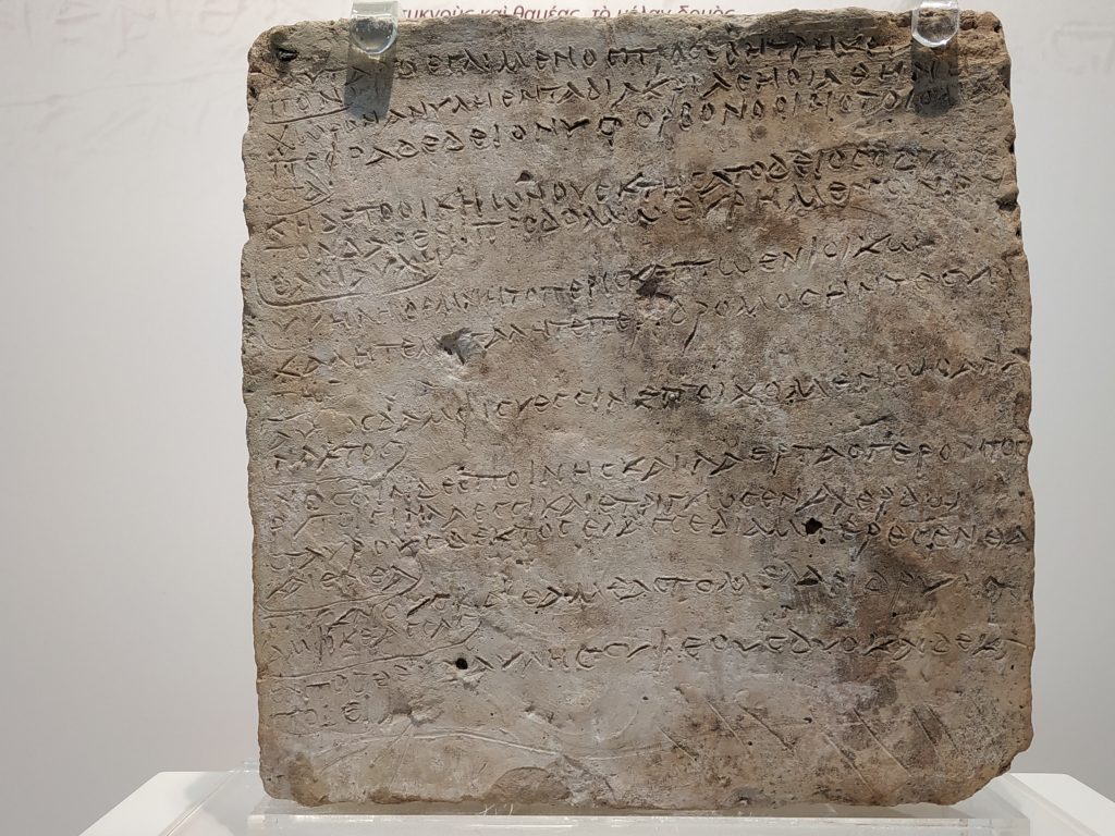 Et puis, dans une vitrine, ces vers sur « une page » de terre cuite, les 13 premiers du livre 14 de l’Odyssée qui racontent une rencontre.