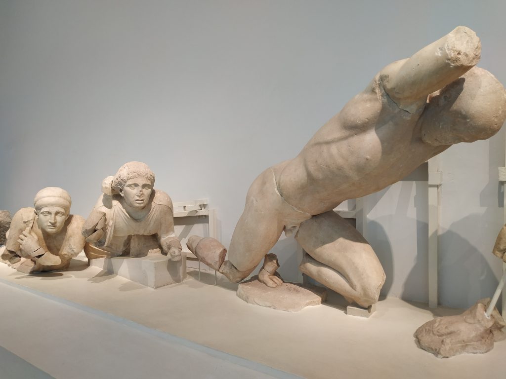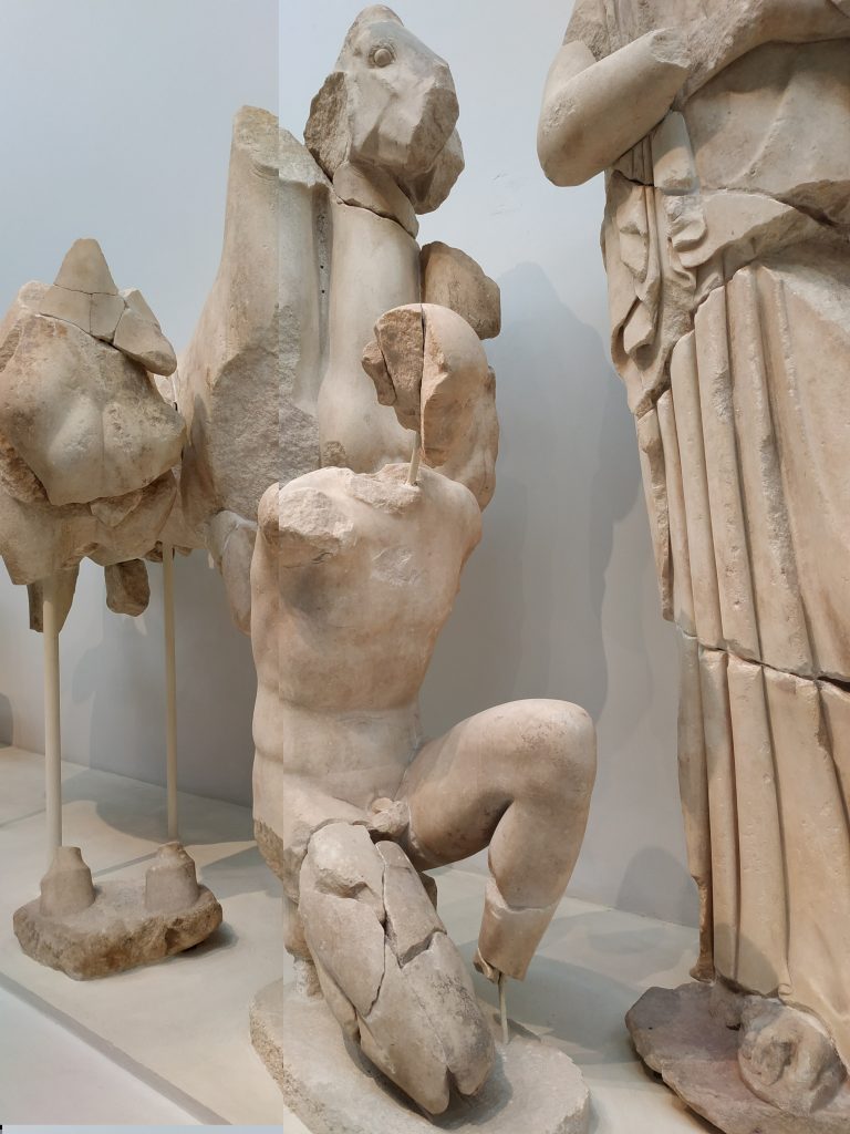 Ce fronton du temple de Zeus, était habité par ces sculptures, elles illustrent l’enlèvement des femmes par les centaures, combattus et par les femmes et par l’aide d’Apollon au centre.
