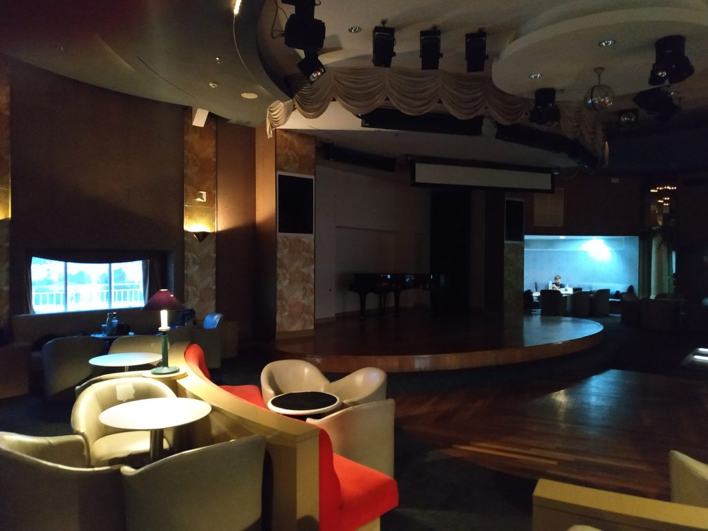 Au dessus de nos têtes, la boule à facettes, les projecteurs, les poursuites, orientés vers le piano à queue sur la scène.