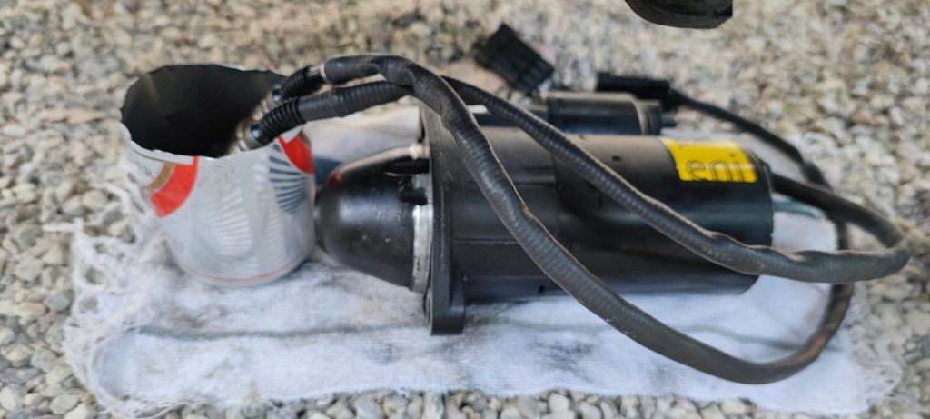 J’ai entrepris ce soir un nettoyage des sondes lambda, immergées pour la nuit dans du nettoyant injecteurs, on voit ci-dessous les deux soiffardes le nez dans la canette de bière. A droite, c’est le démarreur, qui va bien, mais il faut le démonter pour déposer des sondes.