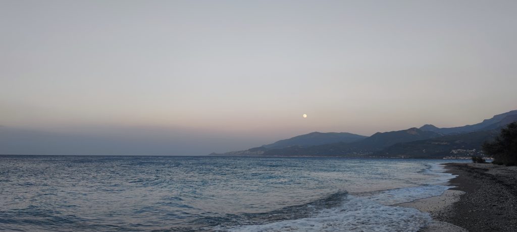 Après une nuit réparatrice et un petit déjeuner complet, on reprend la route de bord de mer destination Akrata. Côté moto, la série de ratatouilles, que je croyais passées, revient. Je me résous à l’achat d’un nettoyant injecteurs à mélanger à l’essence. Il y a du mieux, on peut rouler presque normalement sur cette belle route de bord de mer.