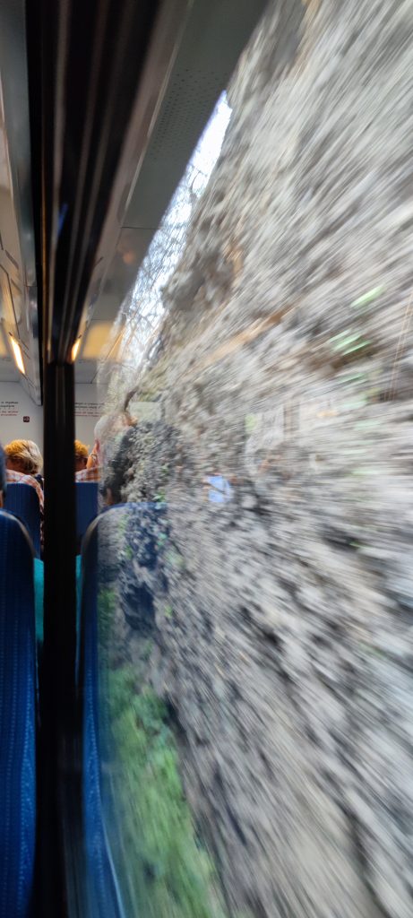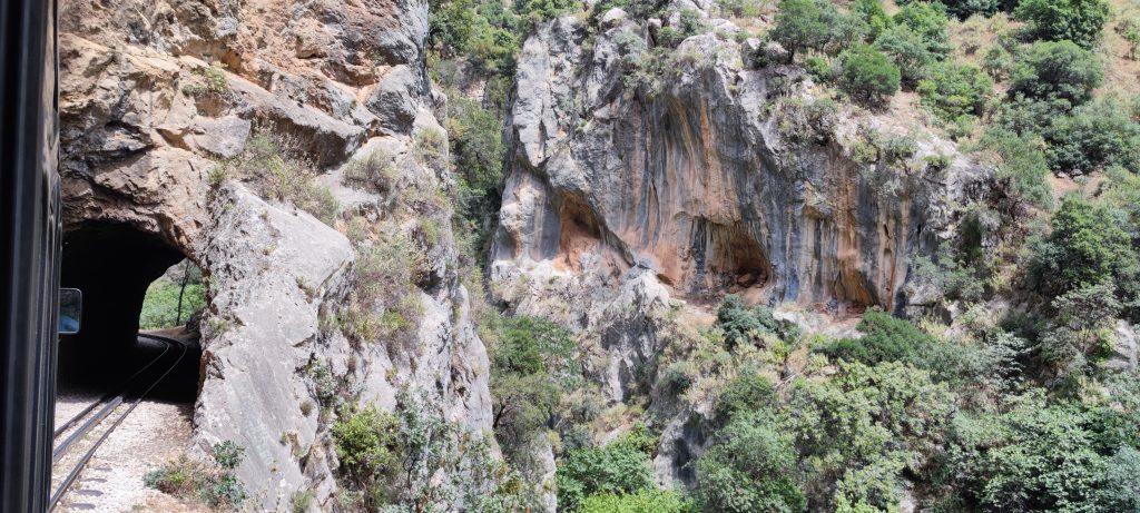 Des tunnels bien sûr, mais aussi d’impressionnantes passes taillées dans la roche qui forment une voute au dessus du train, un tunnel ajouré si l’on veut !