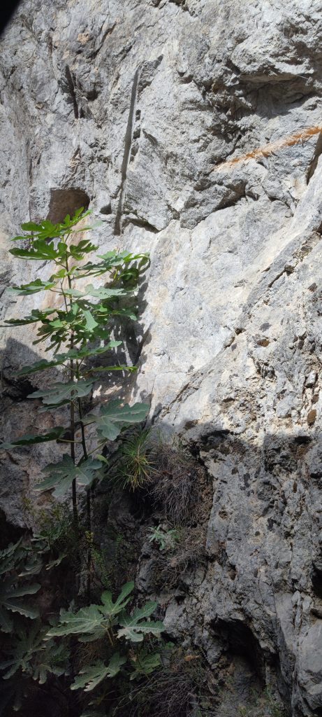 Lors d’un passage où le train s’arrête reprendre son souffle, et enclencher la crémaillère, on voit ce figuier, qui a trouvé assez de terre pour s’accrocher ici, juste au dessus des traces de perforateur dans la roche…