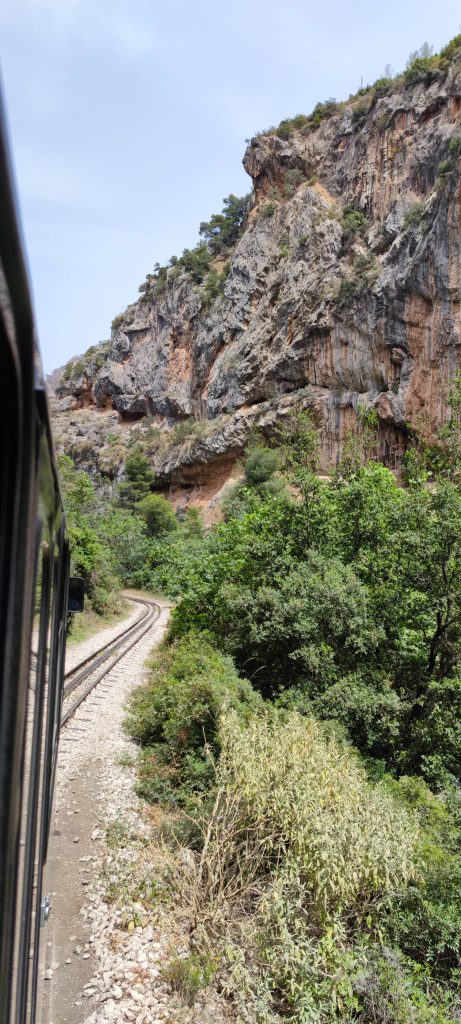 Le train s’ébranle en douceur, longe la mer très peu de temps et puis se dirige vers les montagnes pour remonter le Vouraikos, rivière impétueuse et dont on voit ce dont elle est capable en crue, à la largeur de son lit et aux arbres qu’elle charie.