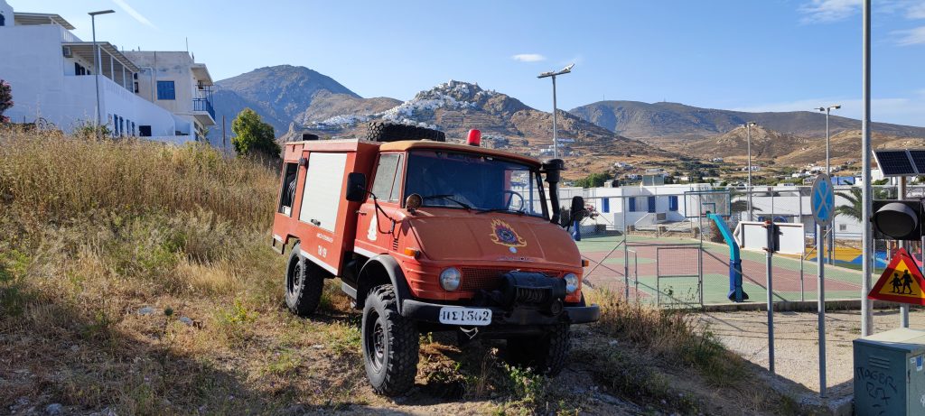 Première photo le lendemain matin pour la sortie d’exploration de notre quartier et du village de Livadi, 660 habitants. Un Unimog-Mercedes des pompiers, camion d’intervention 4×4 pouvant grimper dans les maquis les plus reculés.