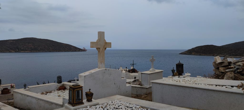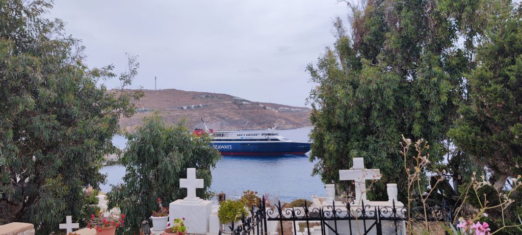 Petit détour par le cimetière qui offre un point de vue surplombant sur les arrivées et départs des bateaux -une activité en soi, que de voir ce ballet réglé comme un spectacle !