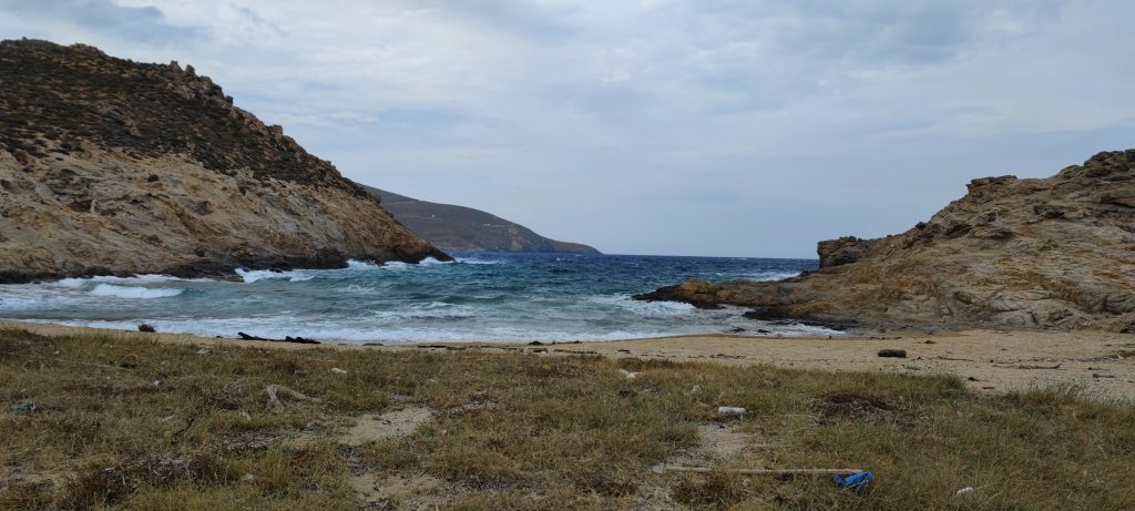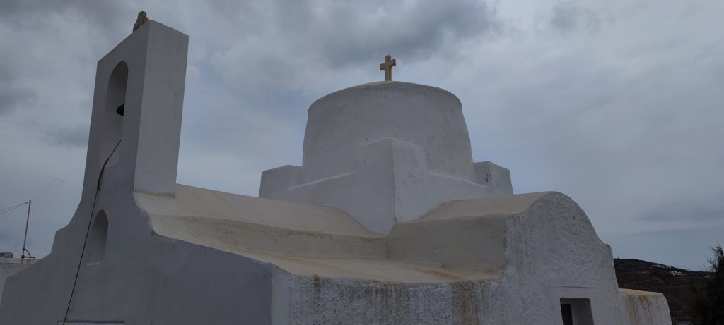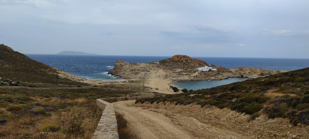 Par cette piste on descend vers la petite église de la baie d’Agios Sostis. A peine visibles sur la photo, le long du mur en second plan sur la gauche, des maisons basses de pierres locales, se fondent extrêmement bien dans le paysage aride de l’île. Une réussite d’intégration, j’aimerais bien voir l’une d’elles de près, mais elles semblent habitées. Ces longs murs font partie des pratiques ici sur l’île. On en voit partout dans le paysage. On ne sais pas s’ils délimitent des parcelles où paîssent encore parfois les chèvres, ou s’ils ont une autre fonction.