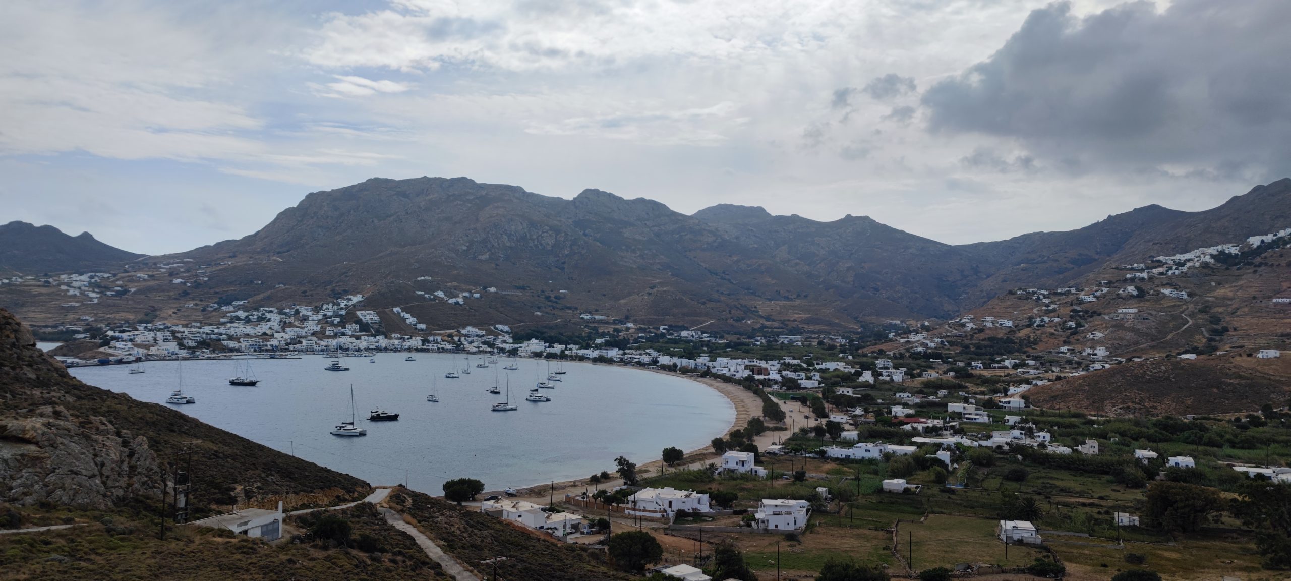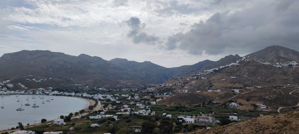 On reprend notre chemin, longeons la plage et grimpons sec la petite route de béton brut, avec cette vue panoramique ci-dessus) en nous retournant à mi chemin. A droite Chora, construite sur la montagne à flanc de rocher, tellement blanche qu’on pourrait la croire de neige ou de glace… A gauche la baie de Livadi.