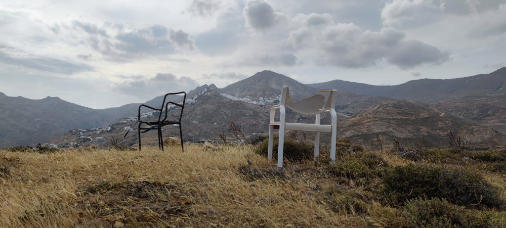 Plus haut, ces deux chaises, dont il est difficile de penser que le hasard les ait placées là… Orientées qu’elles sont, l’une vers Livadi, l’autre vers Chora.