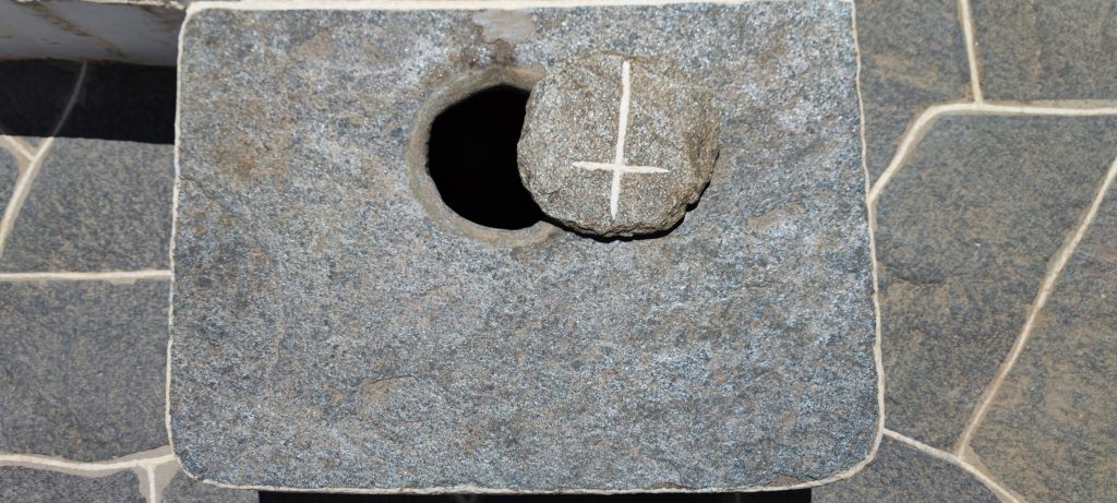 Ici la petite église dont je ne sais pas écrire le nom, qui est en contrebas de la belle mais close. Au moment d’en sortir, nous sommes intrigués par une pierre plate taillée en rond et posée sur ce qui ressemble à un banc. C’est en fait un puit d’eau fraîche ! On en a vu également dans d’autres églises depuis.
