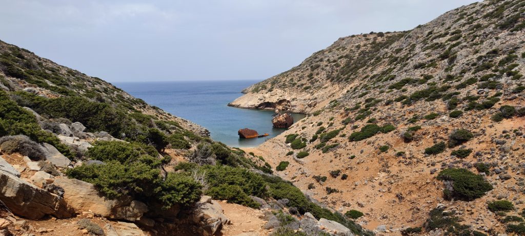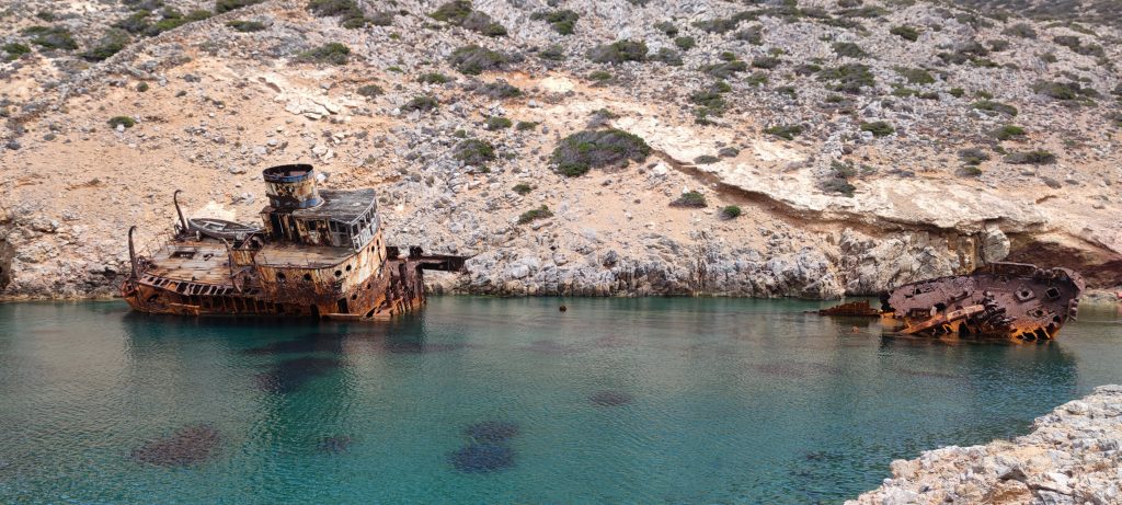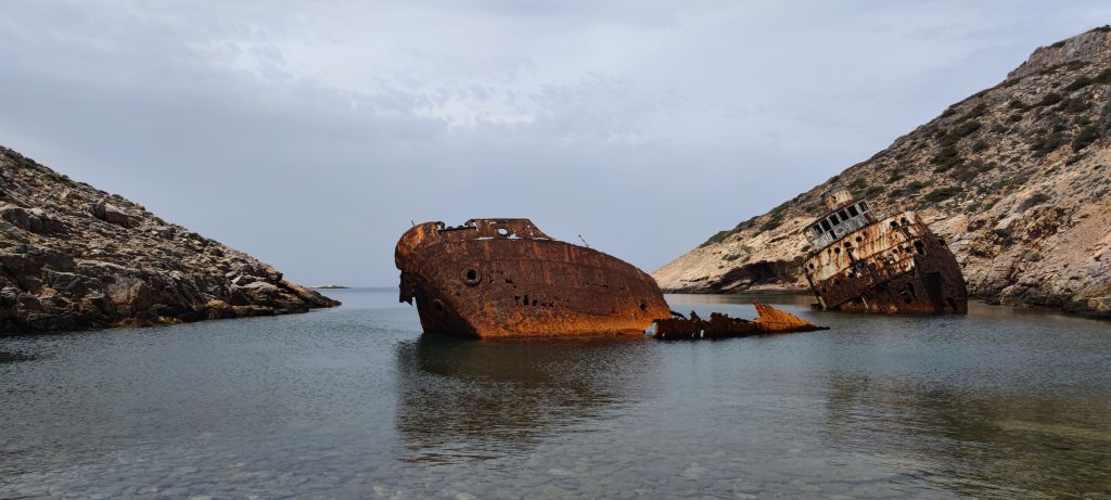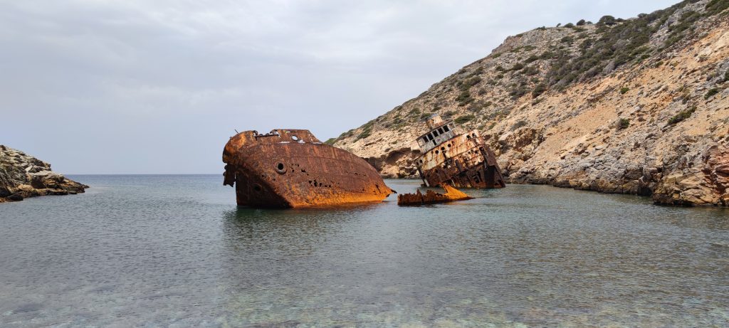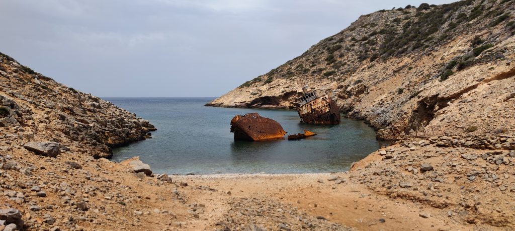 Le 13 février 1980, le capitaine du cargo chypriote, en route pour le port de Tartous en Syrie cherchait un abris près des côtes d’Amorgos pour échapper aux vents violents du nord. Ses espoirs furent vains lorsque la mer en furie jeta l’Olympia dans la baie de Liverio où il s’échoua sur des rochers. Heureusement, l’équipage fut secouru et il n’y a eu aucune victime. » (Source : dustexplorer.com ). Ça, c’est la réalité.