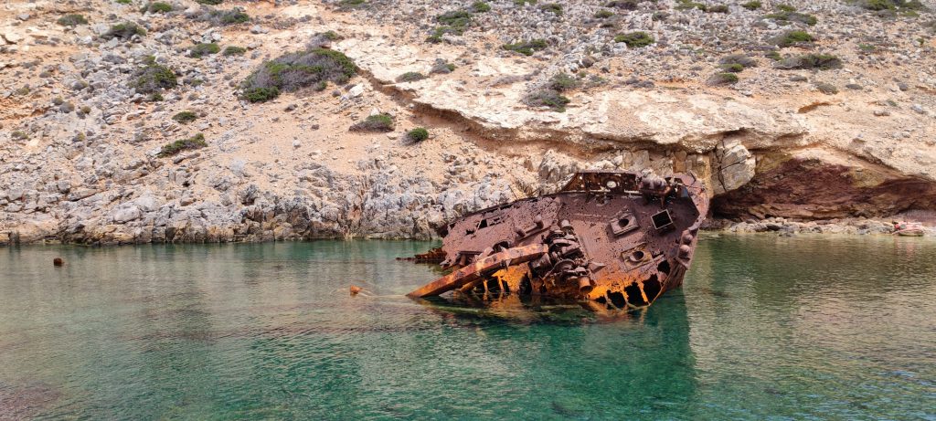 Il fait si chaud qu’on se met de suite à l’eau, limpide, transparente et relativement fraîche. L’épave est là depuis 44 ans, la rouille l’a atteinte dans toutes ses structures. Le film Le grand Bleu a été tourné en 1988, soit seulement 8 ans après l’échouage du bateau, ce n’est donc plus du tout la même épave : celle-ci s’est considérablement altérée. Prudence !