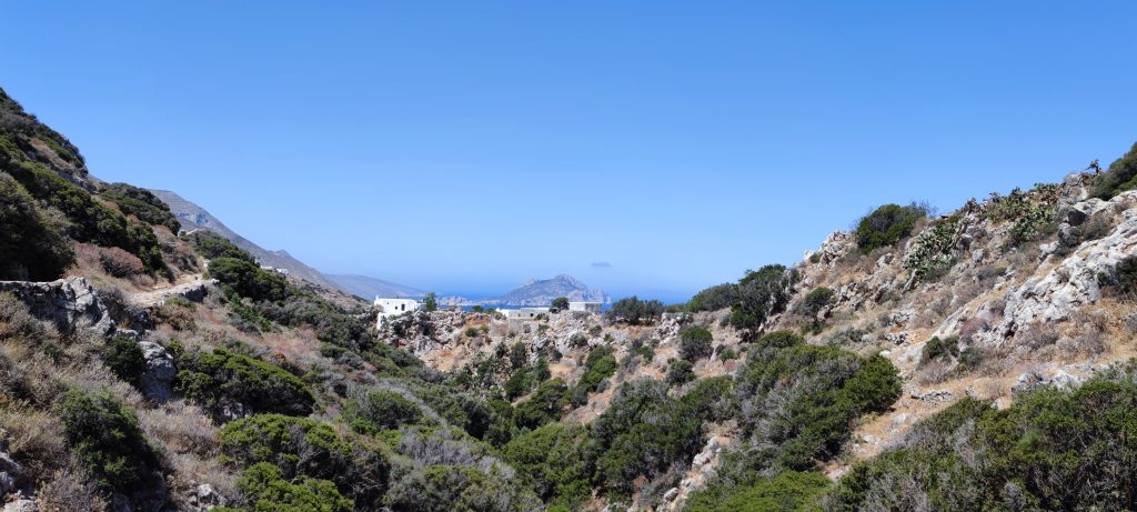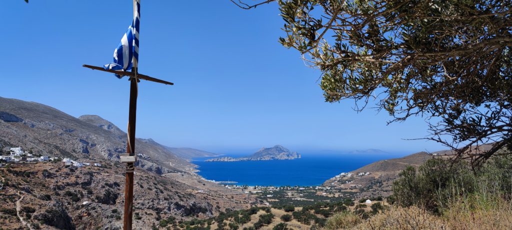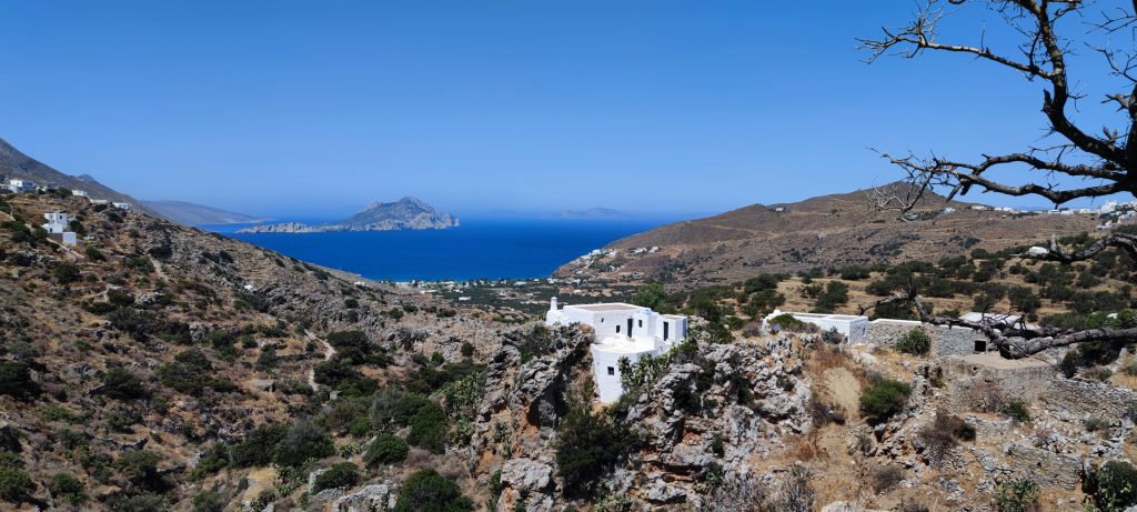 La chapelle constituait le but de notre petite marche. D’ici on voit la baie d’Aegiali et l’île déserte de Nikouria dans le prolongement.