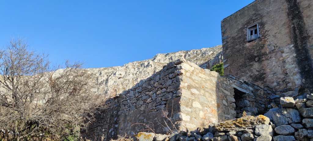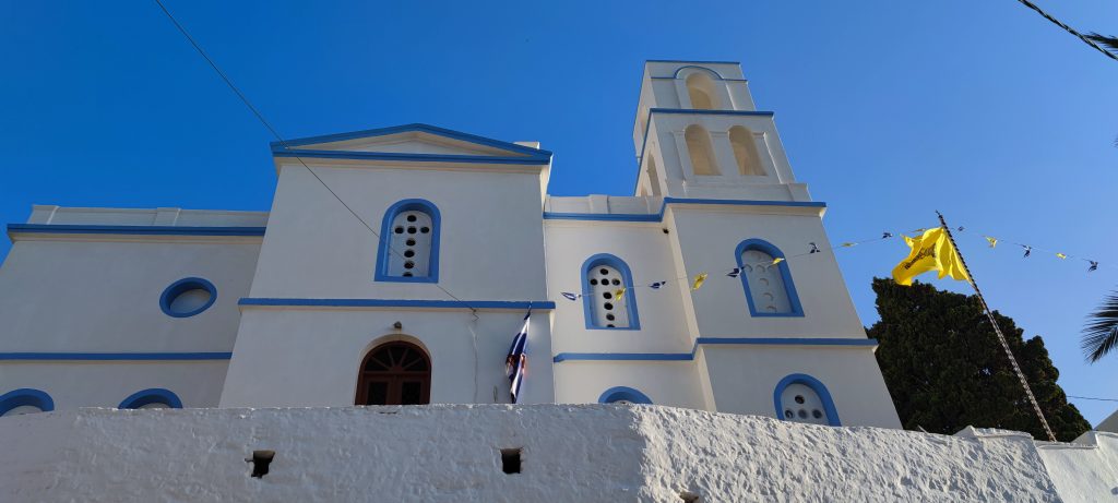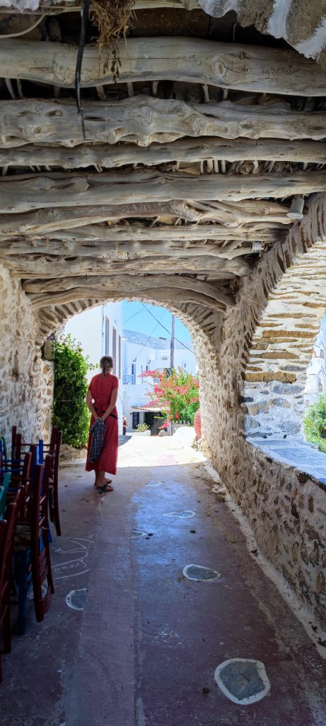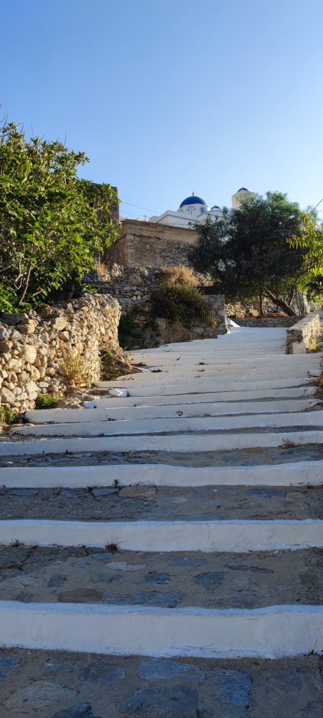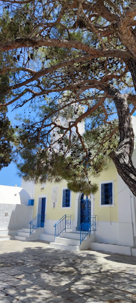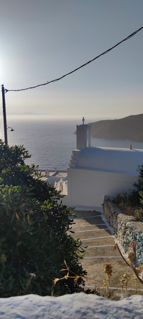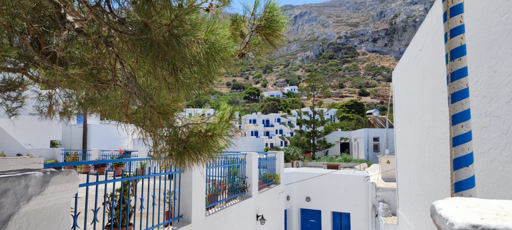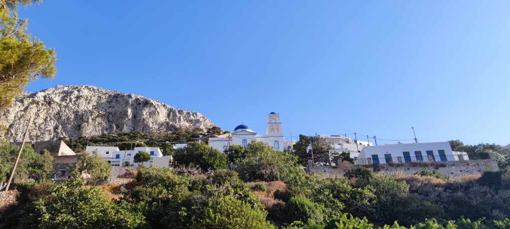 Ici nous sommes venus à pied, car le village est comme un quartier d’Aegiali, mais un quartier haut perché à flanc de montagne, un petit nid d’aigle.
