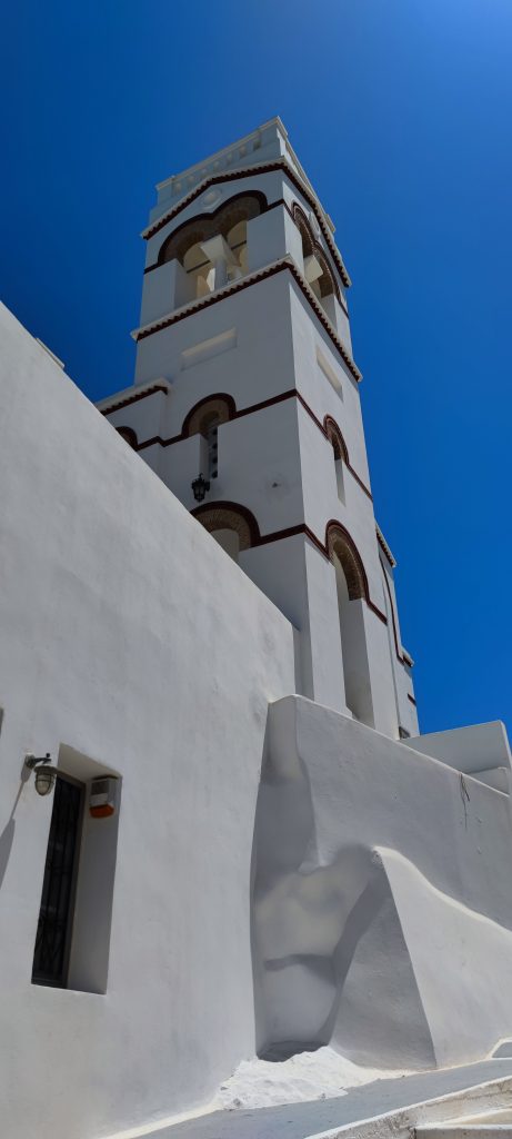 Au retour, nous entrons à nouveau dans le village et débouchons, hasard du dédale de ruelles blanches, sur la place de l’église, en plein centre animé.