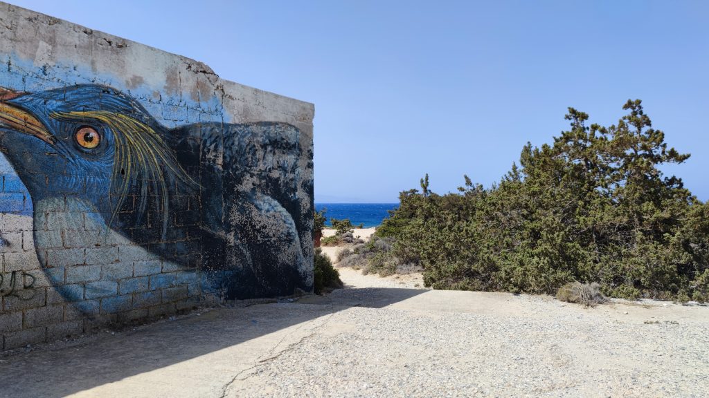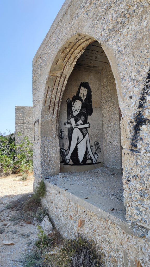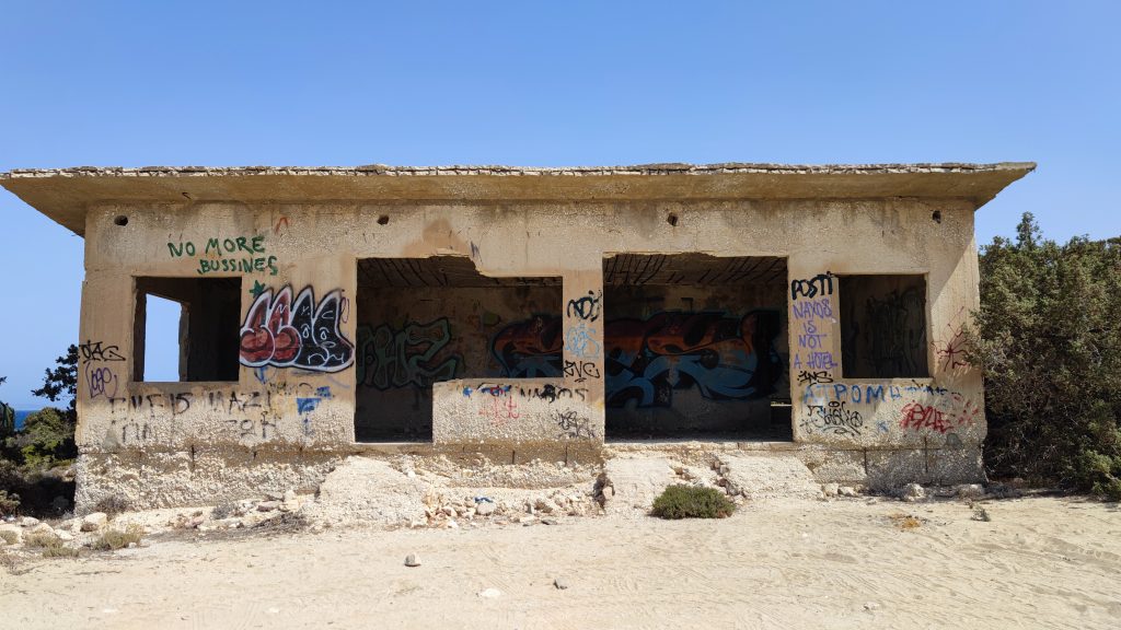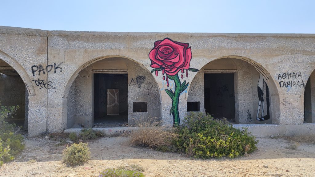 Bain rapide avant d’être transformés en statues de sel et sable ! Un café Grec à l’ombre d’une treille rafraîchissante et nous reprenons le side pour aller voir l’hôtel désaffecté que nous avions vu depuis le ferry en arrivant sur l’île.