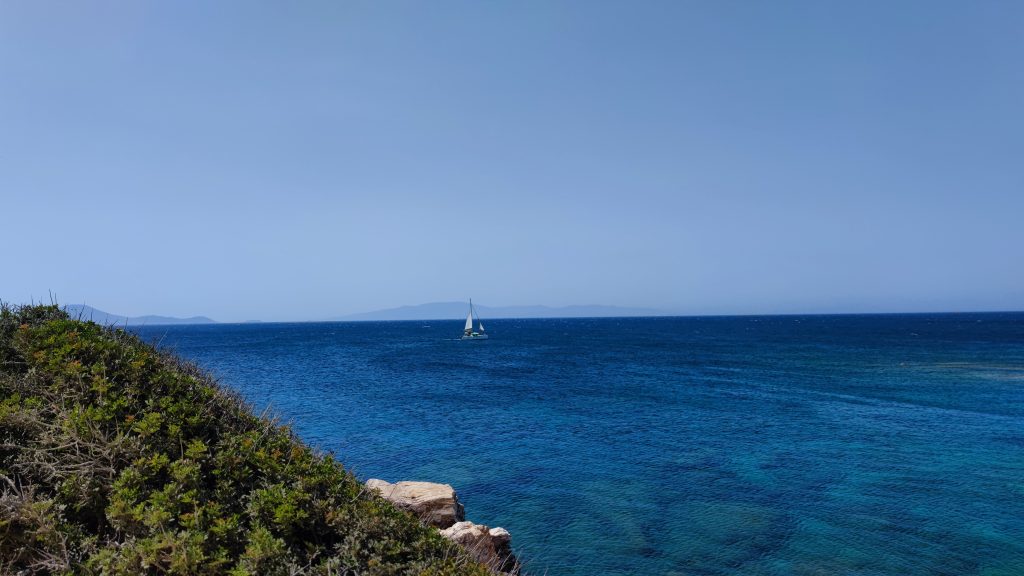 Le site est superbe, au bord de l’eau, plus haut de quelques mètres, surplombant une petite crique de sable bien abritée du Meltemi.