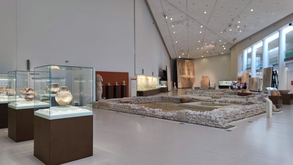 Au centre, dans ce volume principal, les reconstitutions de fresques et sols en mosaïques, période romaine. Sur les murs et dans les vitrines, les objets et sculptures trouvées dans les fouilles.