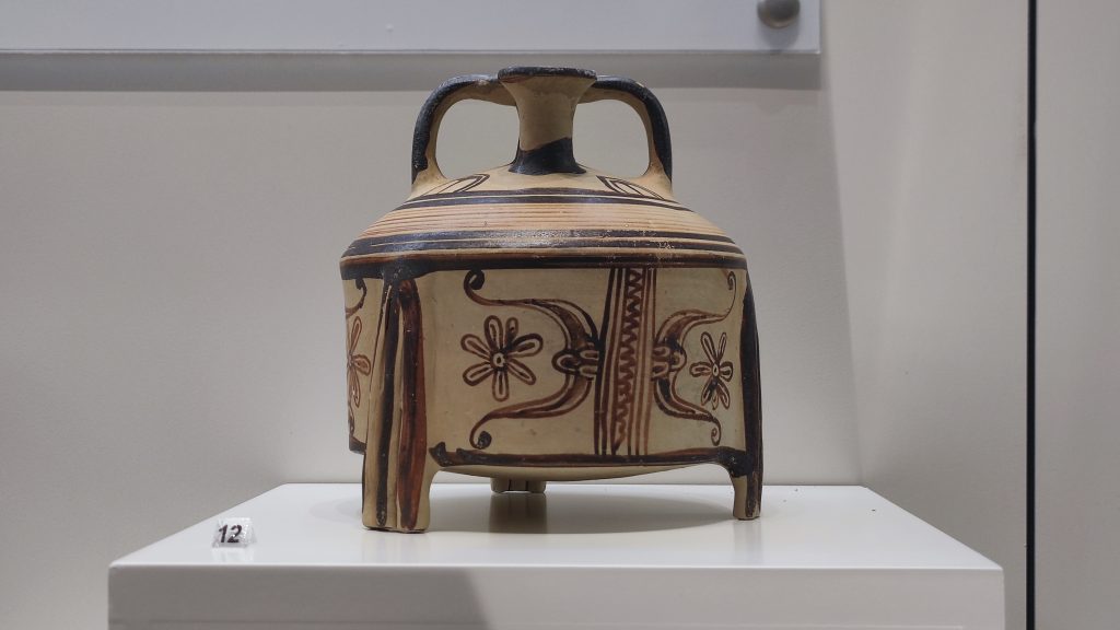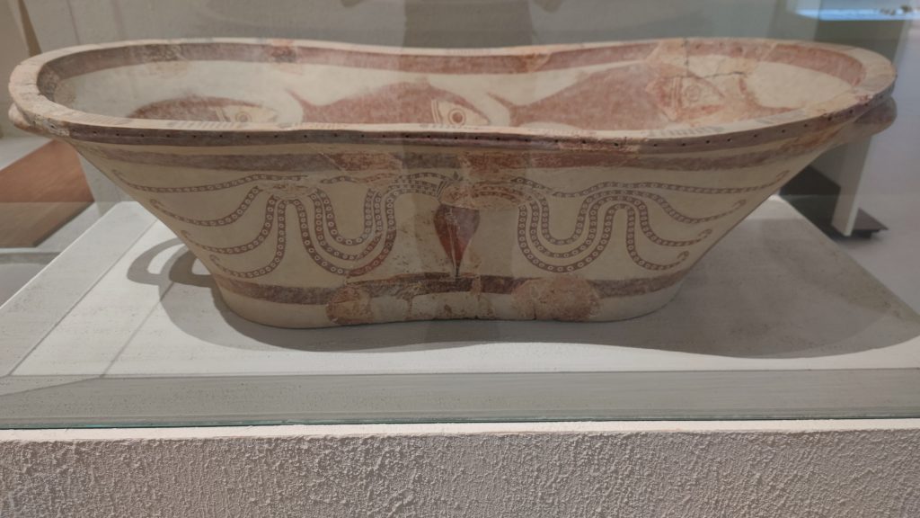 Malgré les représentations de poissons et de poulpe (Minoan style), ce n’est pas une baignoire mais un cercueil très rare. Terre cuite peinte. 13ème siècle avant J.C