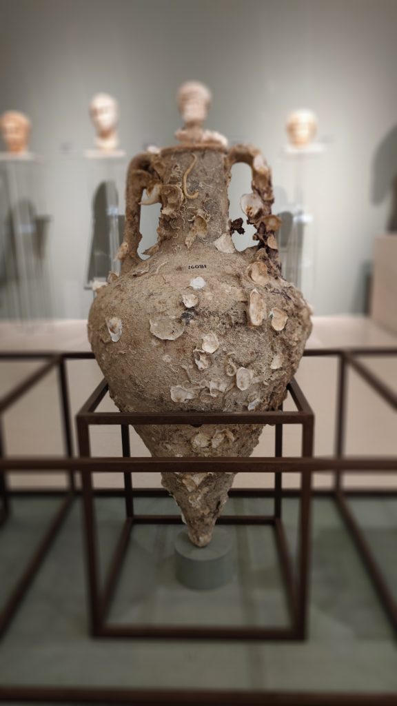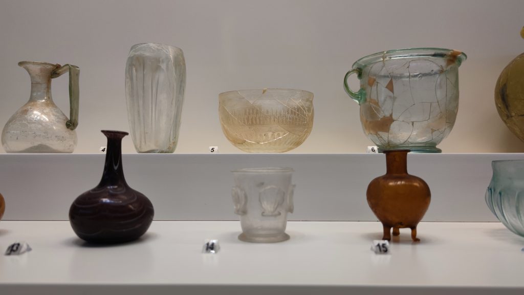 Vases et carafes en verre, période romaine (1er à 4ème siècle après J.C). C’est très beau et touchant de voir que ces objets si fragiles aient pu traverser d’aussi longues périodes sans être brisés…