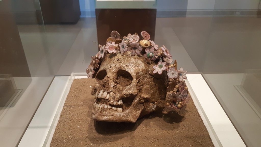 Et puis ces vitrines dont les crânes qui portent encore leurs bijoux, nous laissent sans voix. Le propre de ce qu’on appelle en arts, une vanité. Ces crânes encore décorés de leurs parures nous disent quelque chose comme « carpe diem », la vie est courte et la mort est longue, profite, pauvre fou.