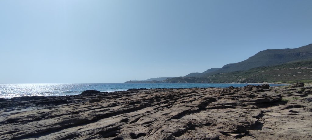 Délice que cette route côtière qui file vers le sud, d’Alghero à Bosa. Pas vu une seule maison en quarante cinq kilomètres… Seule une bergerie ponctue le paysage d’une présence humaine et animale. On traverse un maquis continu, souvent à flanc de montagne, à une centaine de mètres au dessus du niveau de la mer, que l’on quitte des yeux un moment, pour la retrouver plus loin, de plus haut. On monte et descend, tourne et vire. La route est très belle, le revêtement lui, est chaotique. Les trous fréquents obligent au zigzag et à veiller au grain.