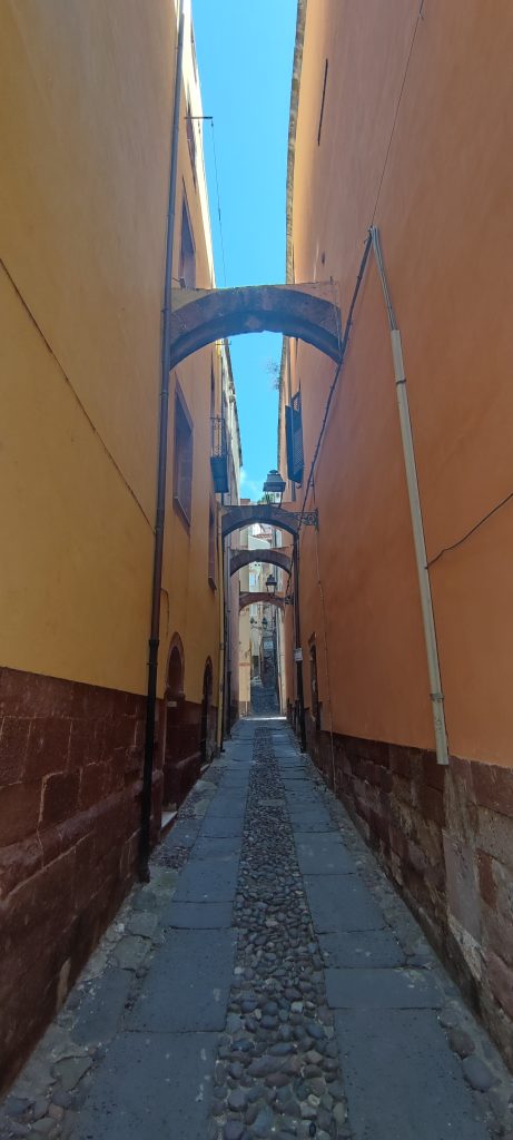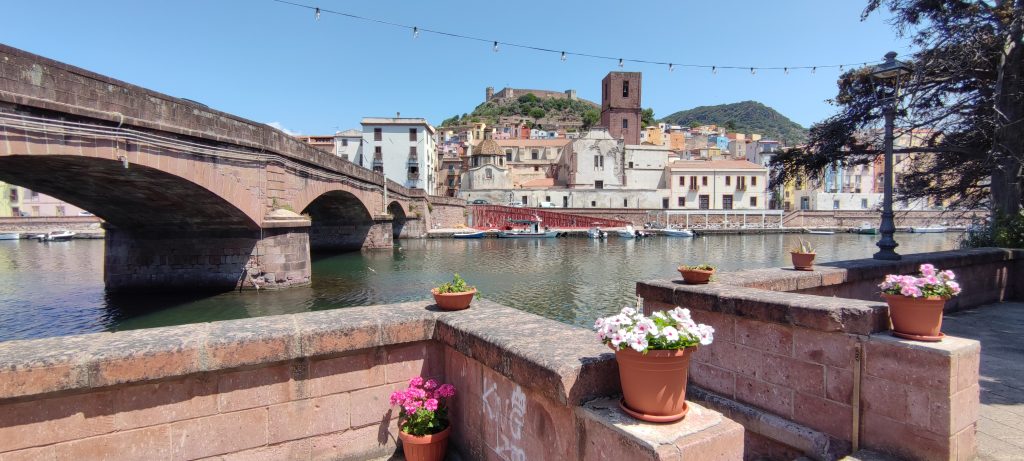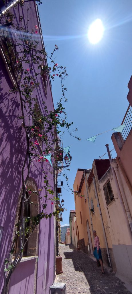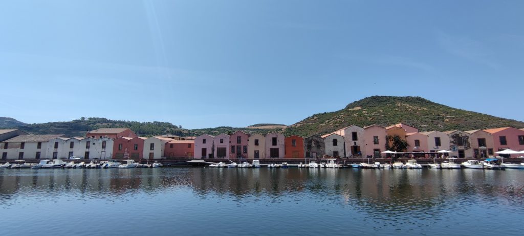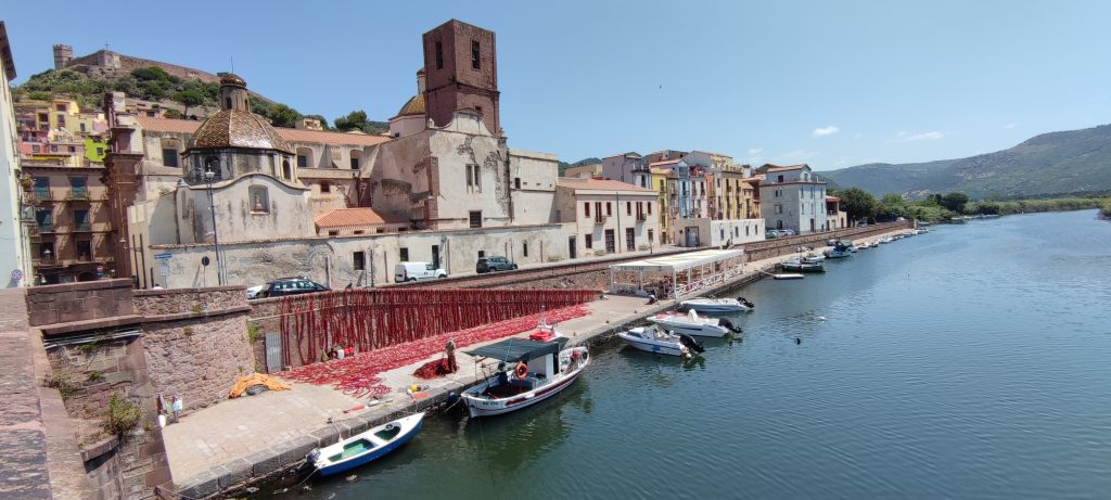 On file à Bosa, 4 km au sud, découvrir la petite ville. Elle est à peine en retrait du bord de mer, suffisamment pour esquiver le bling bling de la marina, elle laisse un beau passage au fleuve Temo, large et puissant des eaux mélangées, deux ponts l’enjambent, l’un ancien à l’est, l’autre moderne à l’ouest. Sur la berge sud, de drôles de maisons colorées de teintes pâles, un peu hautes : d’anciens ateliers de tanneries réhabilitées en habitations et commerces. Sur la berge opposée, Bosa grimpe dru jusqu’au château de Malaspina, fait de tufs et laves rouges, tout comme les maisons de Bosa, donnant à l’ensemble un air surgis de terre très authentique.